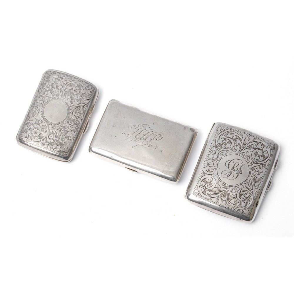 Portasigarette in argento 925 cesellato a motivo floreale e fogliaceo, portasigarette in argento 925 cesellato con monogramma e portasigarette in argento 925 con monogramma (g. 244).