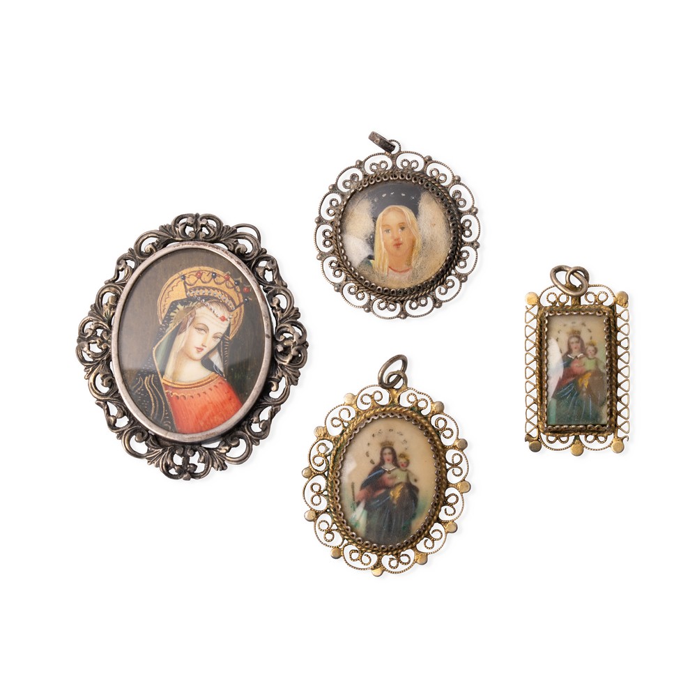 Tre pendenti in argento di cui due in argento dorato ed un pendente/spilla in argento con miniature dipinte "Soggetti Sacri".