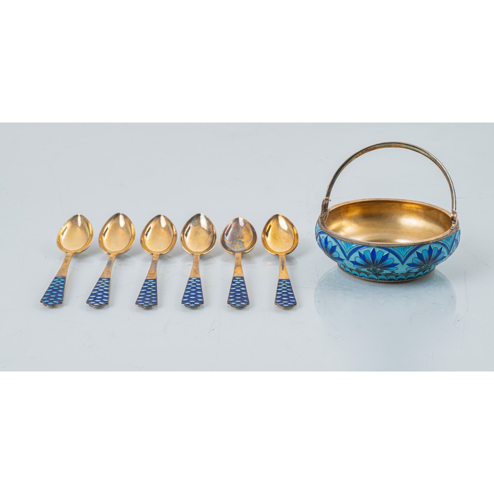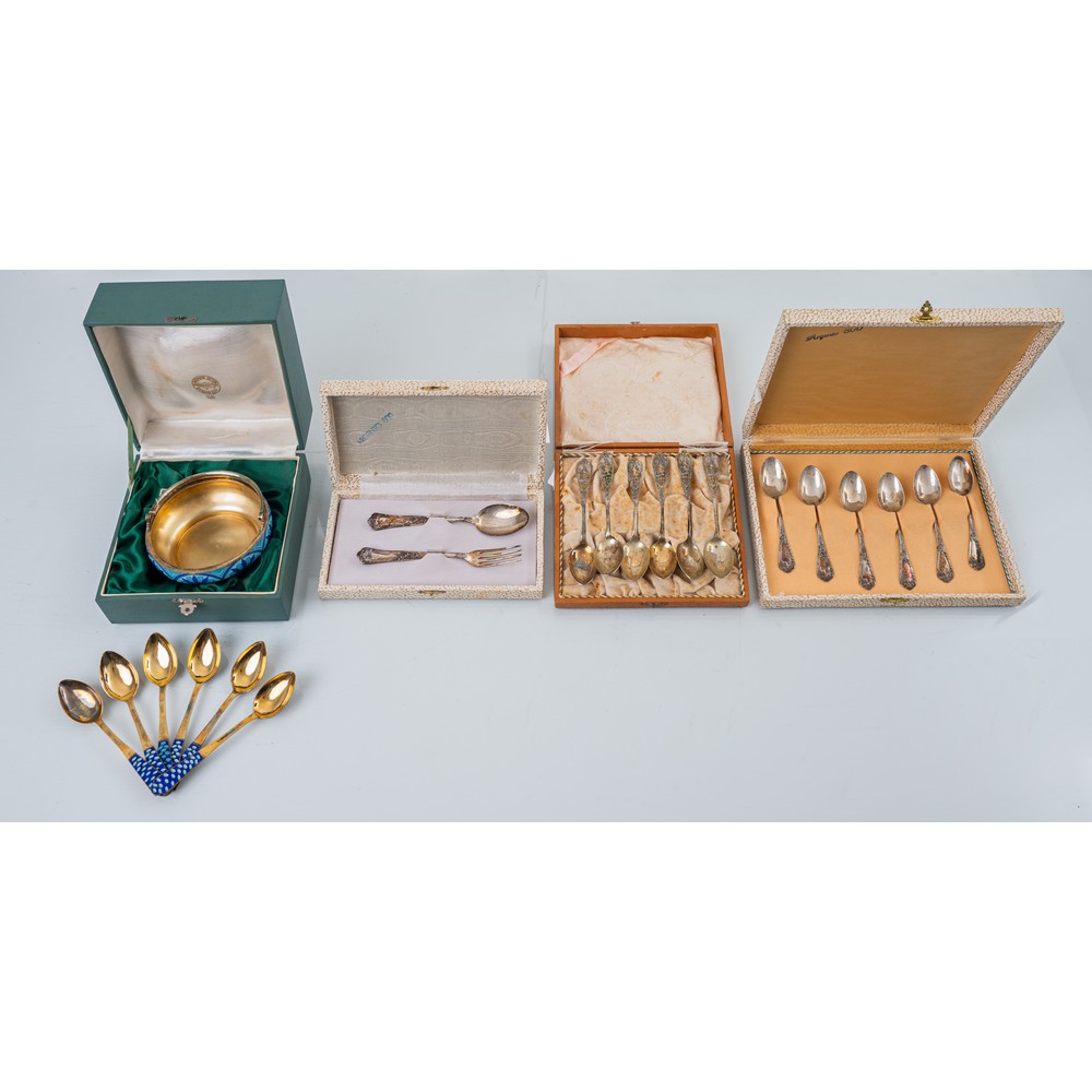 Due cofanetti contenenti sei cucchiaini in argento, cofanetto contenente cucchiaino e forchettina in argento e cofanetto contenente cestino con sei cucchiaini in argento 916 e smalti (g. 526 peso lordo).