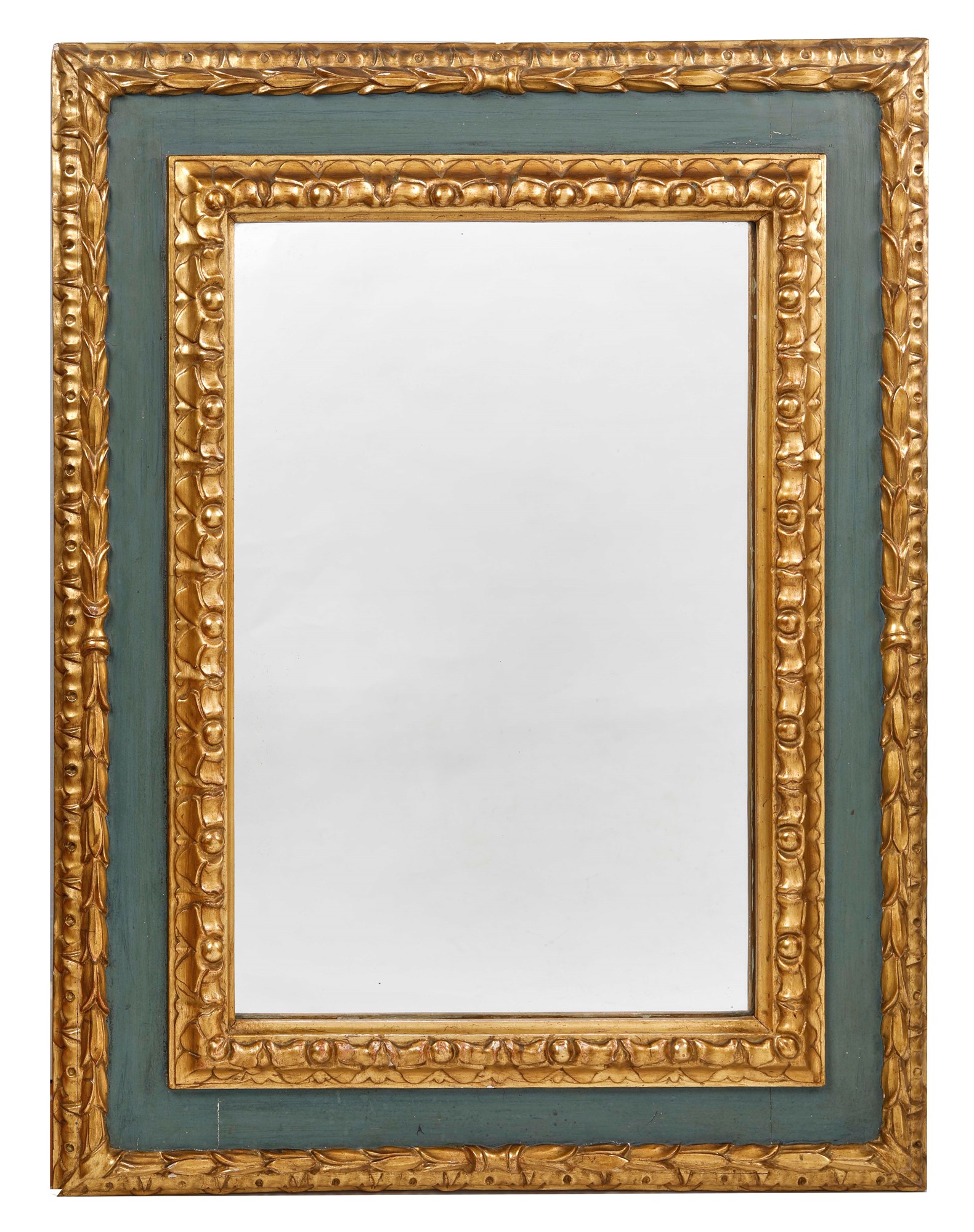 Specchiera con cornice in legno dorato e dipinto verde. XX secolo. Cm 87x65.