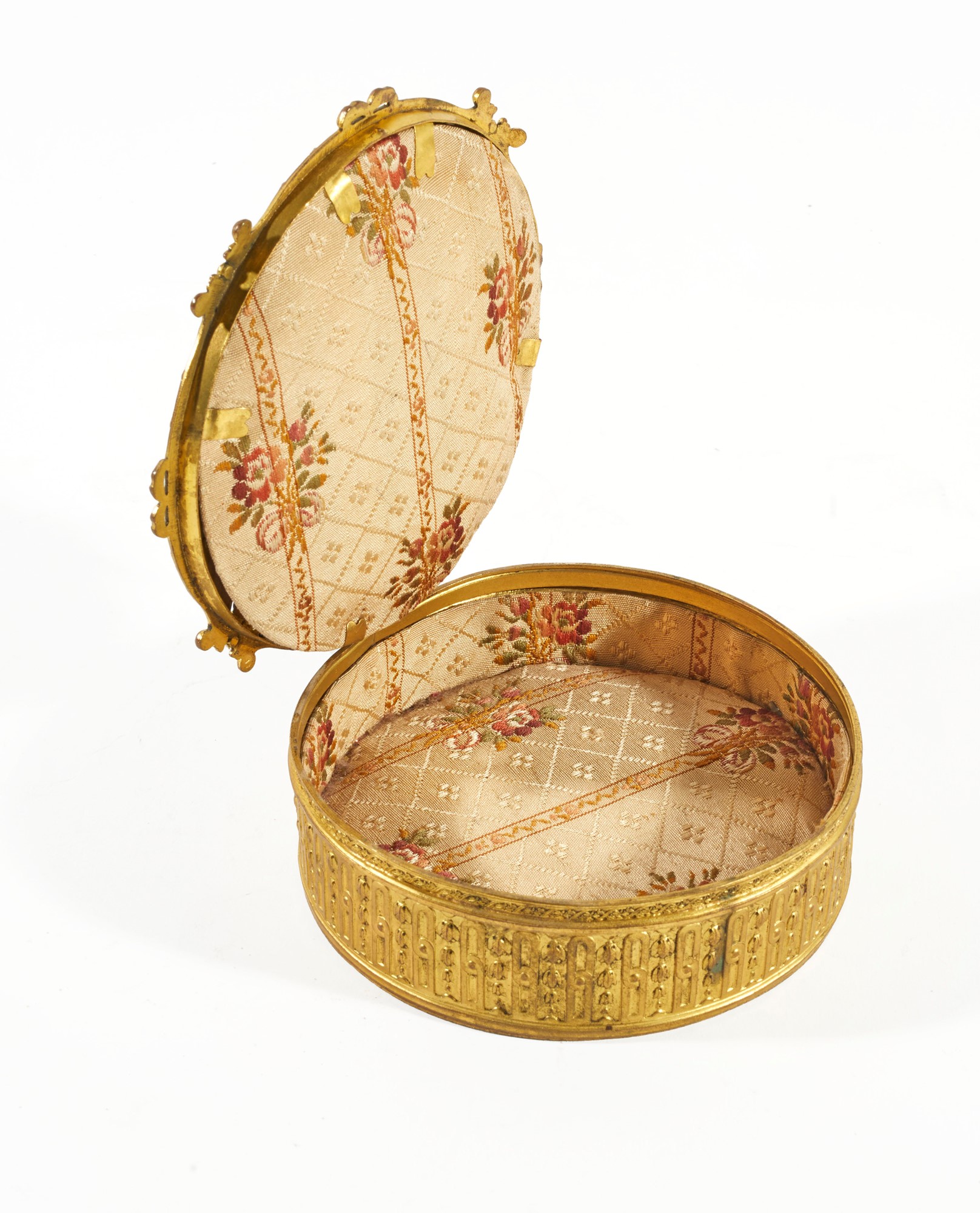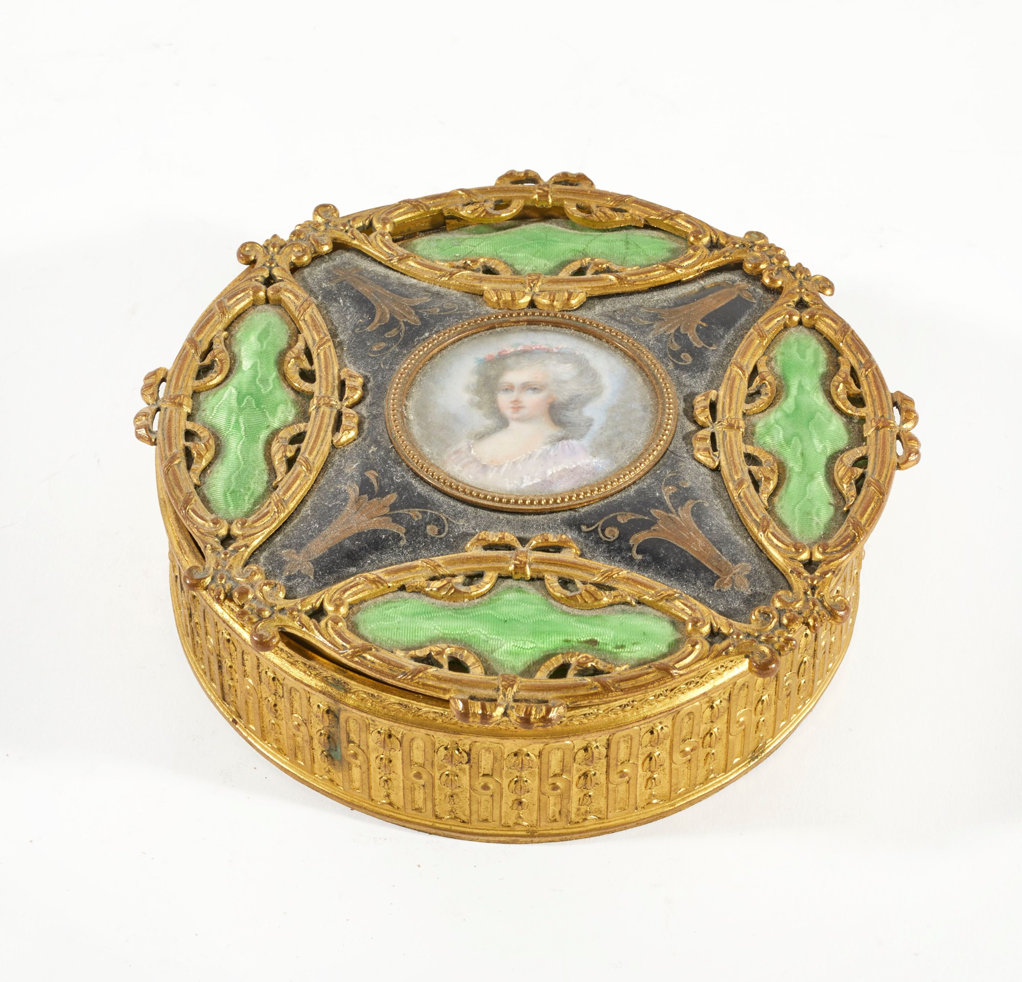 Scatolina in metallo decorata a smalto, Francia, XIX secolo. Cm 4,5x13Ø.