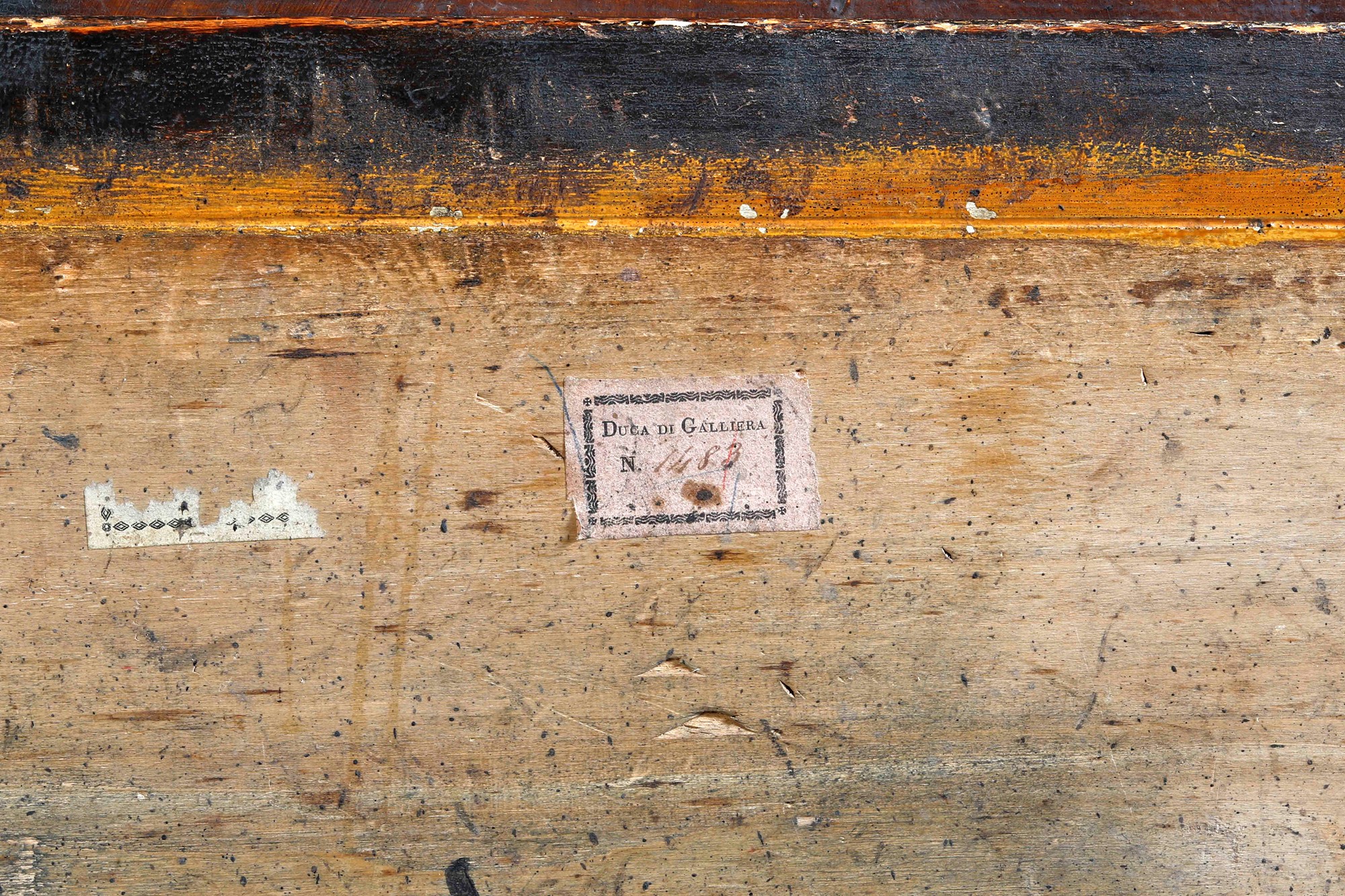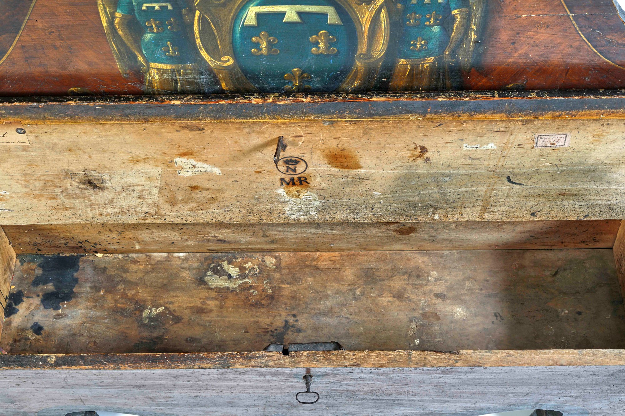 Provenienza: come mostrano i marchi presenti, la cassapanca potrebbe provenire da una casa nobiliare filo-napoleonica.