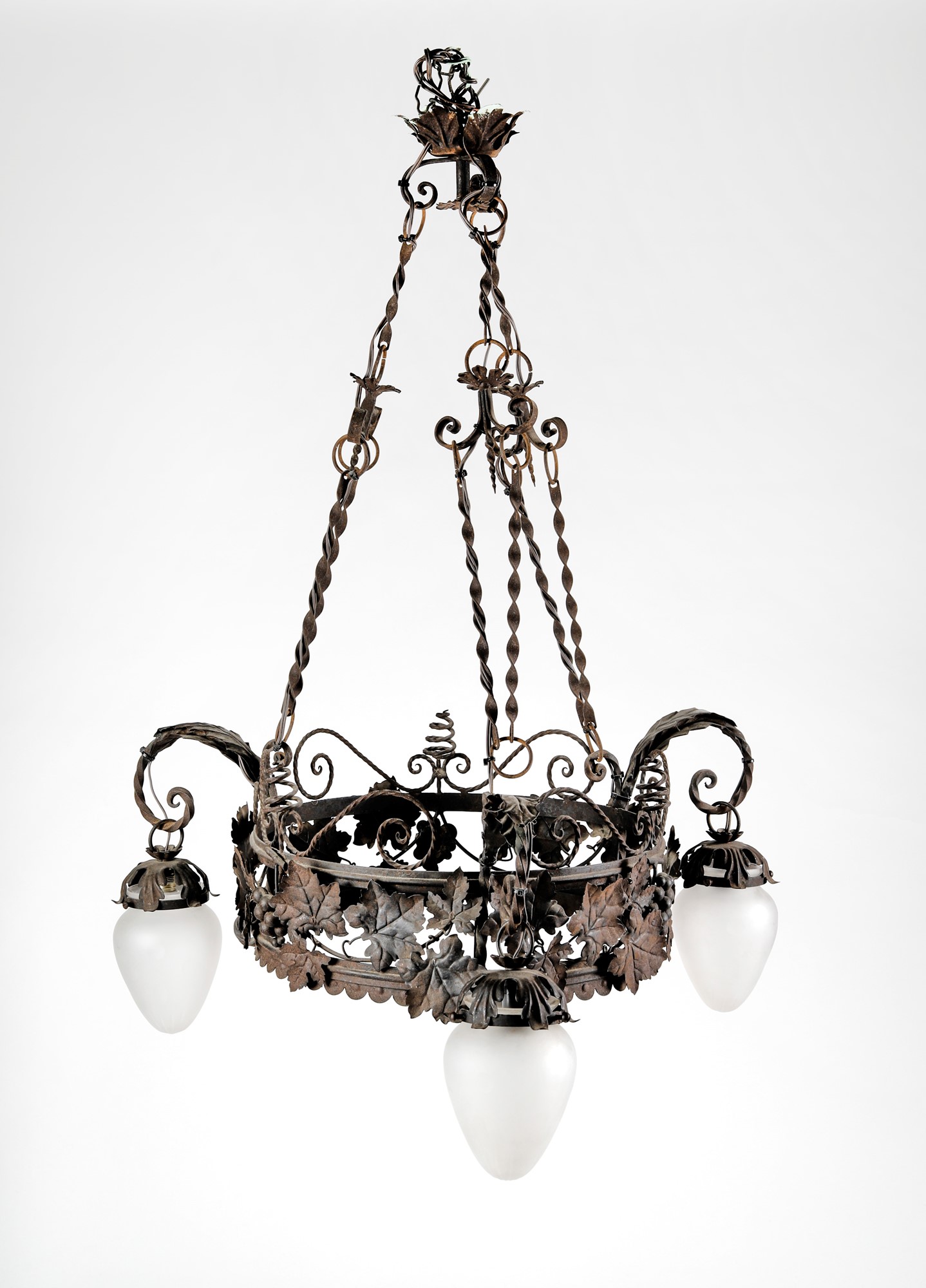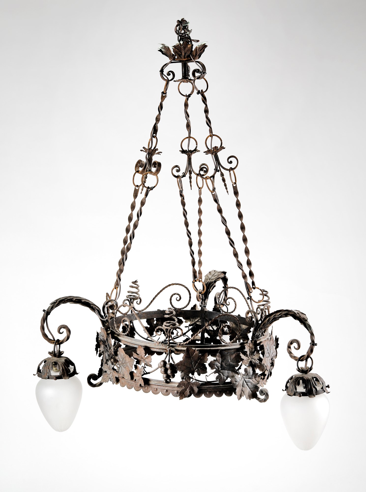 Lampadario in ferro battuto in stile Liberty. Elettrificato. Inizi del XX secolo, Bologna. Cm 115x61.