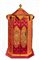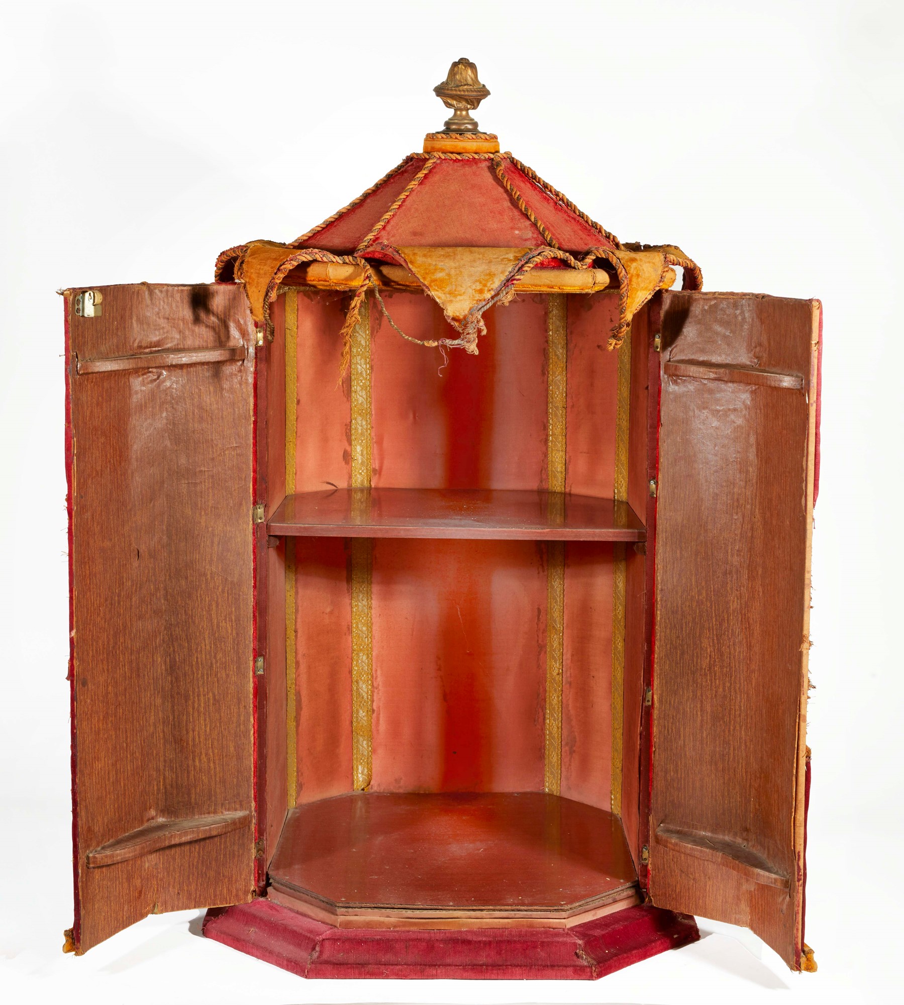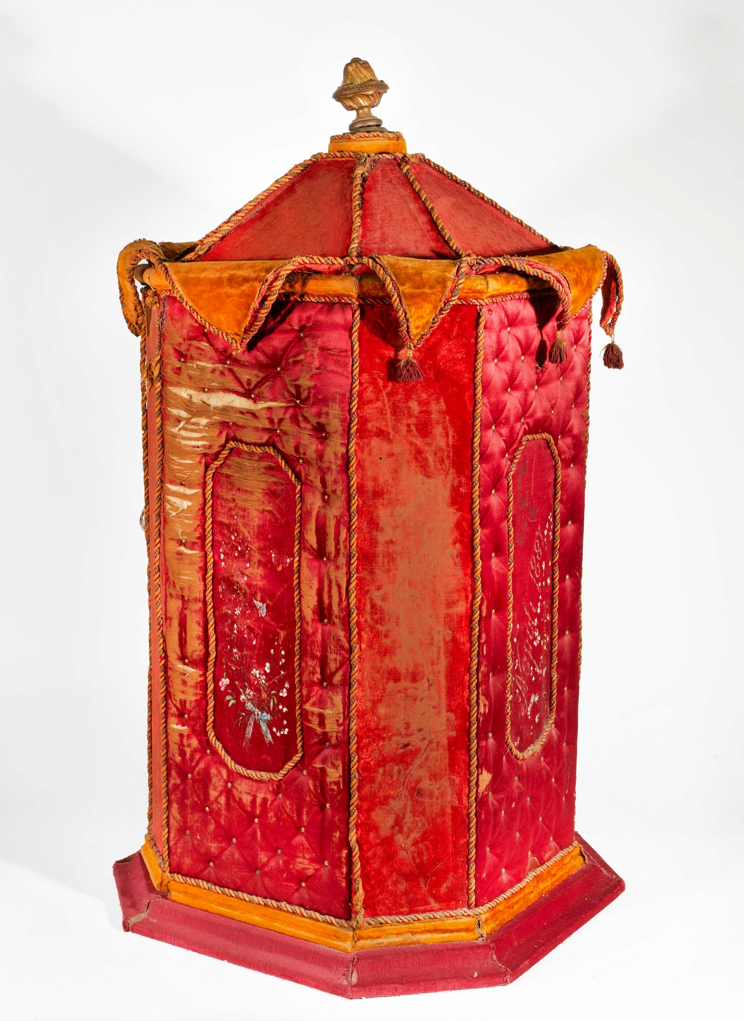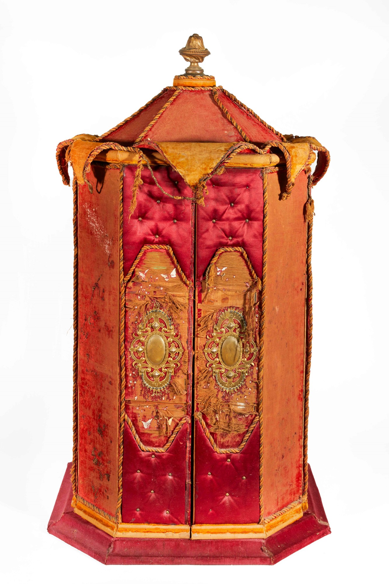Ostensorio da viaggio in broccato rosso cardinalizio. Inizi del XVIII secolo. Cm 100x50Ø (difetti)