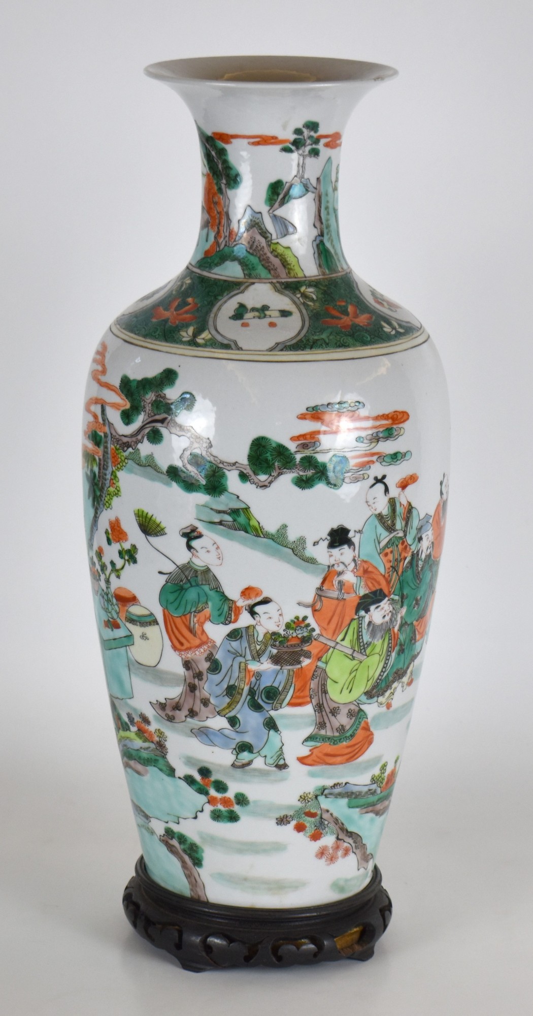 Cina vaso in porcellana decorato con paesaggio e personaggi base in legno incollata