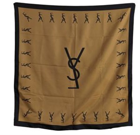 YSL Foulard di seta con logo YSL sfondo senape e blu anni '70 cm 89x89 1970's beige with blue YSL logo silk scarf
