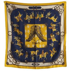 HERMES Foulard in seta con stampa di cavalieri samurai sullo sfondo blu, motivo centrale su base gialla, anni '80 Cm 90x86 1980's blue, yellow and white silk scarf with samurai horsemen