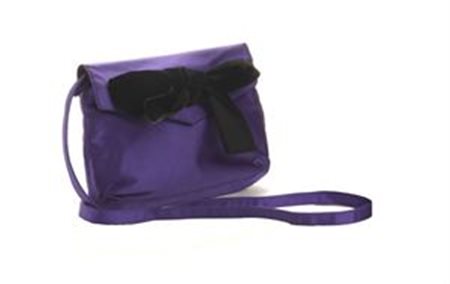 PRADA Pochette con tracolla in raso viola e fiocco di velluto nero sulla pattina di chiusura, anni '80 Cm 17x26 1980's purple satin pochette with shoulder strap with black velvet bow on closure