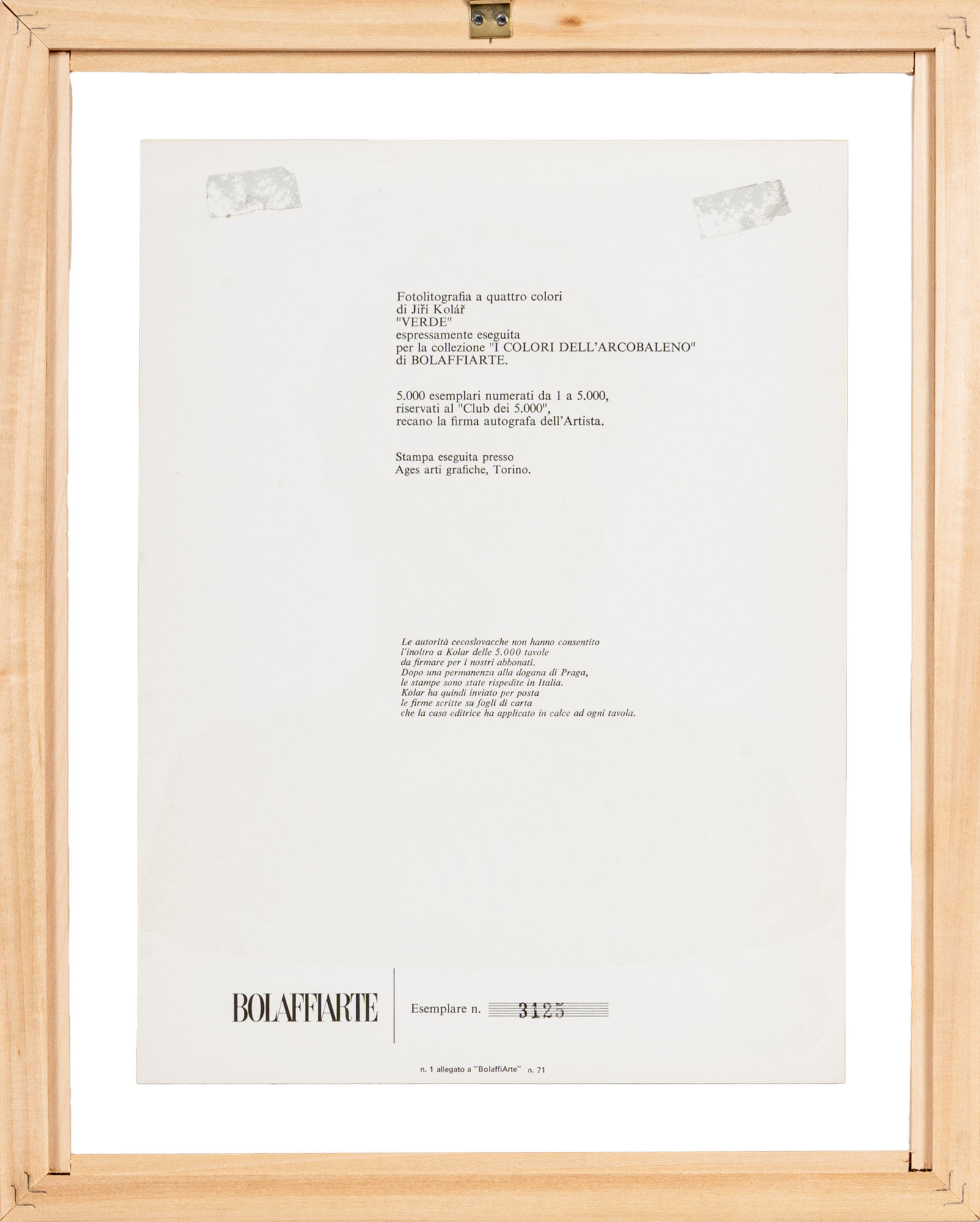 Fotolitografia a quattro colori, es. 3125/5000, su una tiratura complessiva di 5000 esemplari numerati da 1 a 5000, eseguita per la collezione 'I colori dell'arcobaleno' di BolaffiArte, Torino