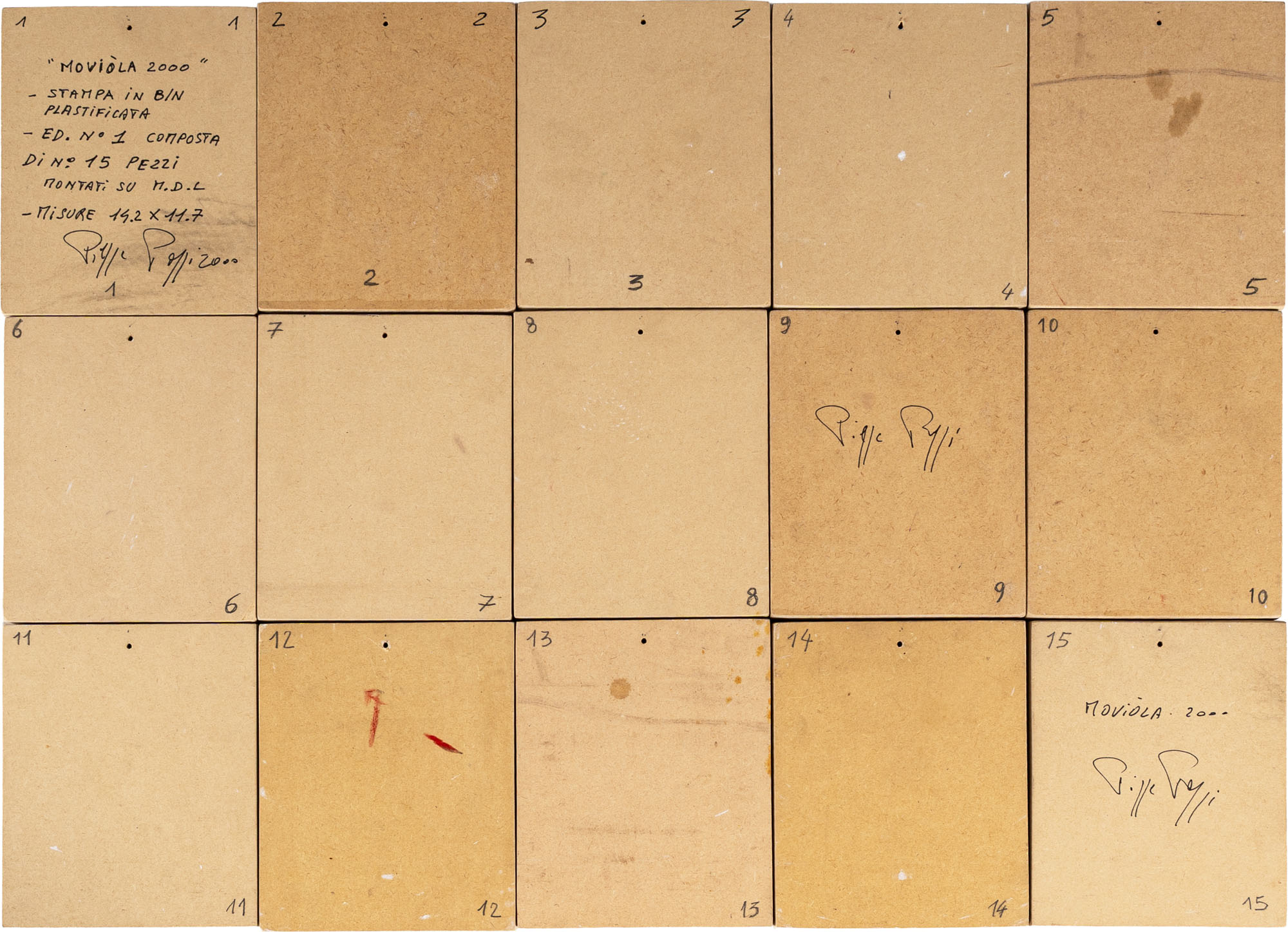 PIERRE POGGI(1954)Moviola 2000 (versione A)2000Installazione composta da 15 stampe fotografiche a colori su MDL, esemplare unicoDimensioni di ciascuna fotografia: 14,2 x 11,7 cmFirma, data e titolo al retro delle stampe n. 1, 10 e 15Opera accompagnata da certificato di autenticità a cura della Galleria Federico Bianchi Contemporary Art, Milano e firmato dall'artistaPROVENIENZA:Galleria Federico Bianchi Contemporary Art, MilanoCollezione privata, Lecco