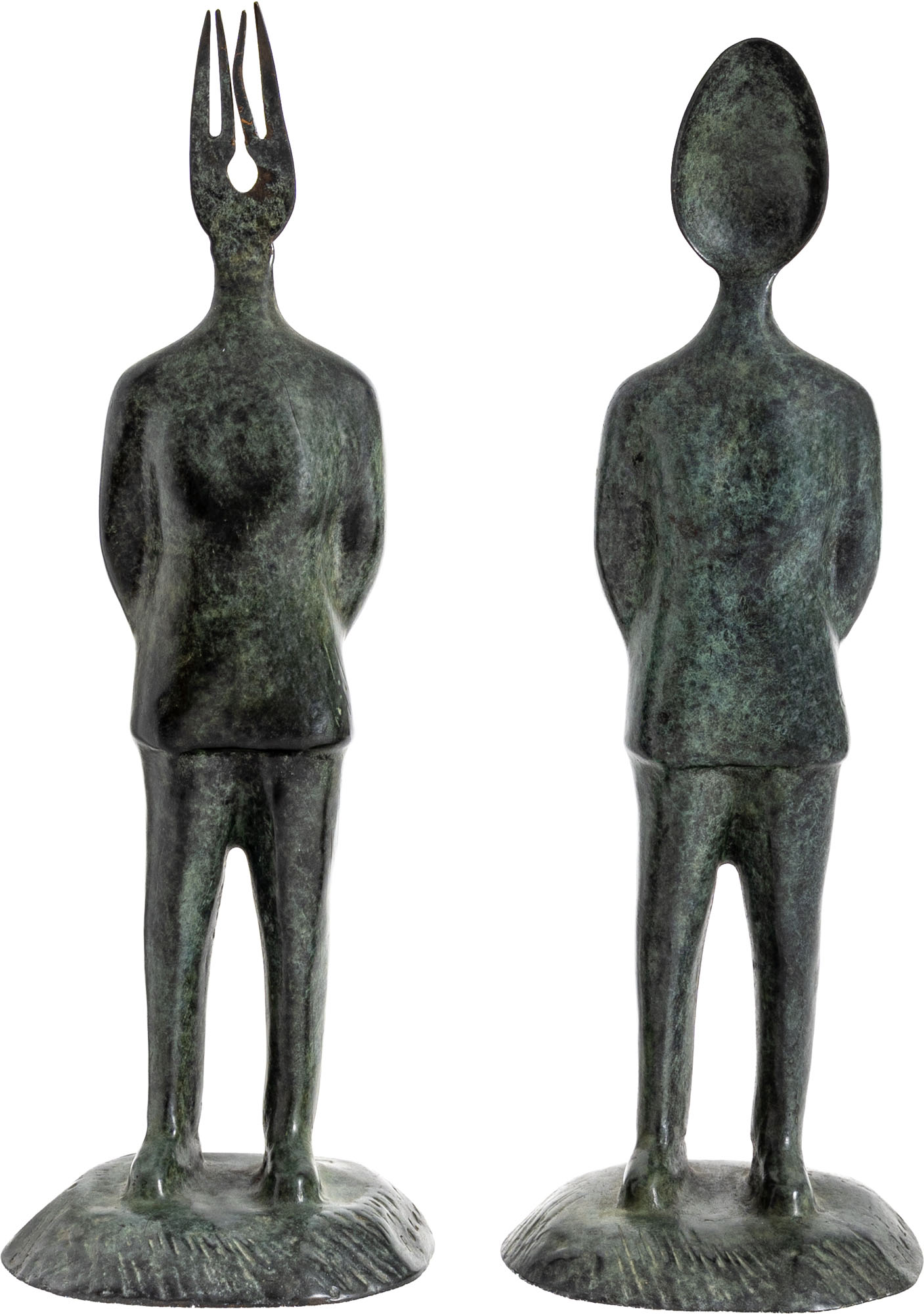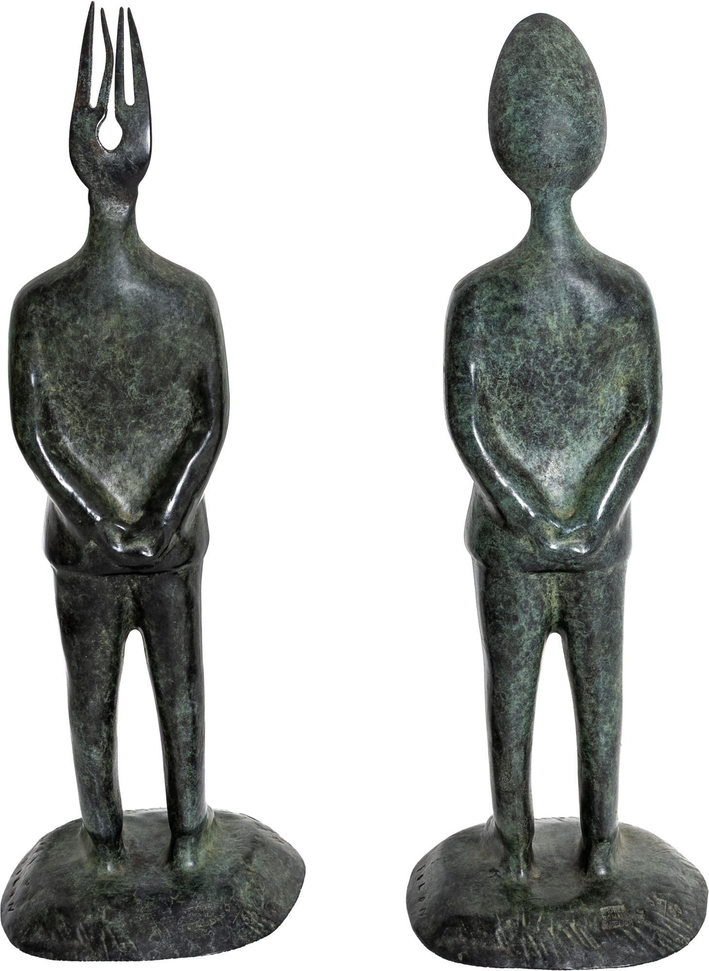 JEAN-MICHEL FOLON(1934 - 2005)Forchetta - CucchiaioLotto composto da due sculture in bronzo, entrambe es. 33/50, fonderia Bronze Romain Barelier (timbri sulle basi)Ogni scultura misura 31 cm di altezzaFirme e numerazioni incise sulle basiPROVENIENZA:Collezione privata, Milano (ricevute direttamente dall'artista)