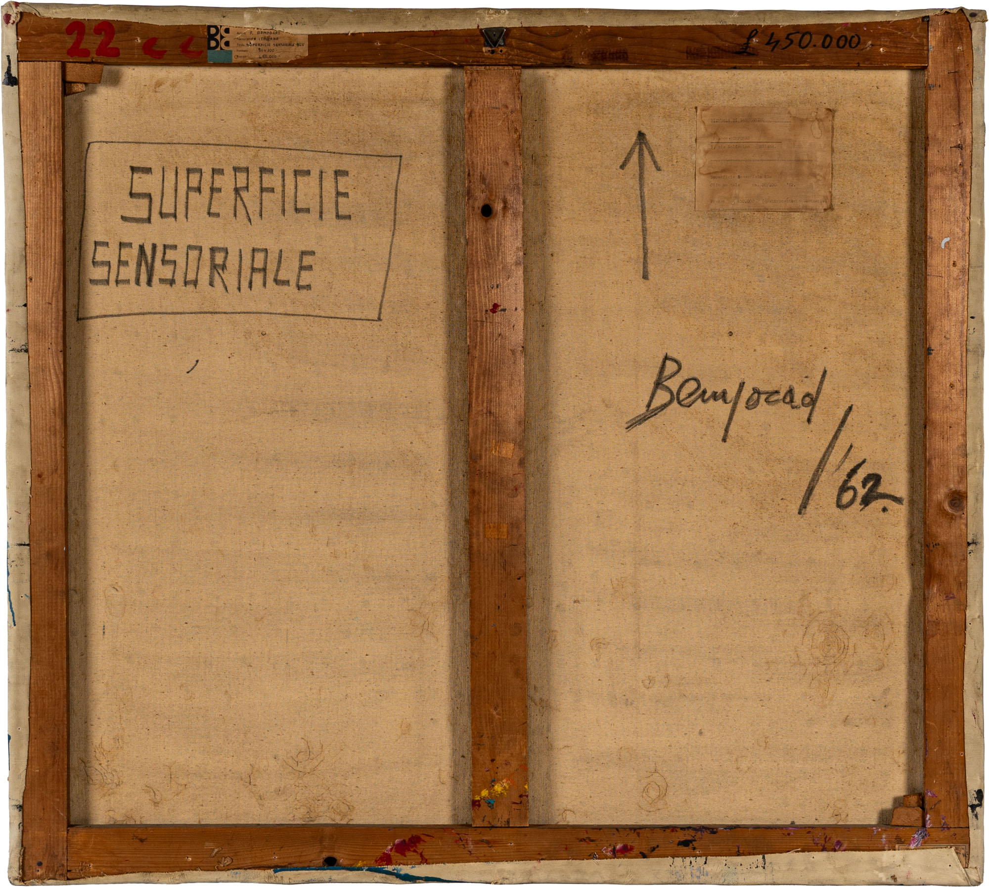 FRANCO BEMPORAD(1926 - 1989)Superficie sensoriale1962Olio su tela90 x 100 cmFirma, data e titolo al retroPROVENIENZA:Collezione privata, MonzaESPOSIZIONI:2005, Franco Bemporad dalla materia al segno, Monza, Milano e Bergamo20 giugno - 20 settembre 1963, IV Biennale Internazionale d'Arte della Repubblica di San Marino - Oltre l'Informale, Repubblica di San Marino (etichette al retro)BIBLIOGRAFIA:D. Astrologo, E. Bucciarelli (a cura di), Franco Bemporad dalla materia al segno, catalogo della mostra tenutasi contemporaneamente a Monza, Milano e Bergamo, Multigraf srl, Bologna - Milano, 2005, p. 72