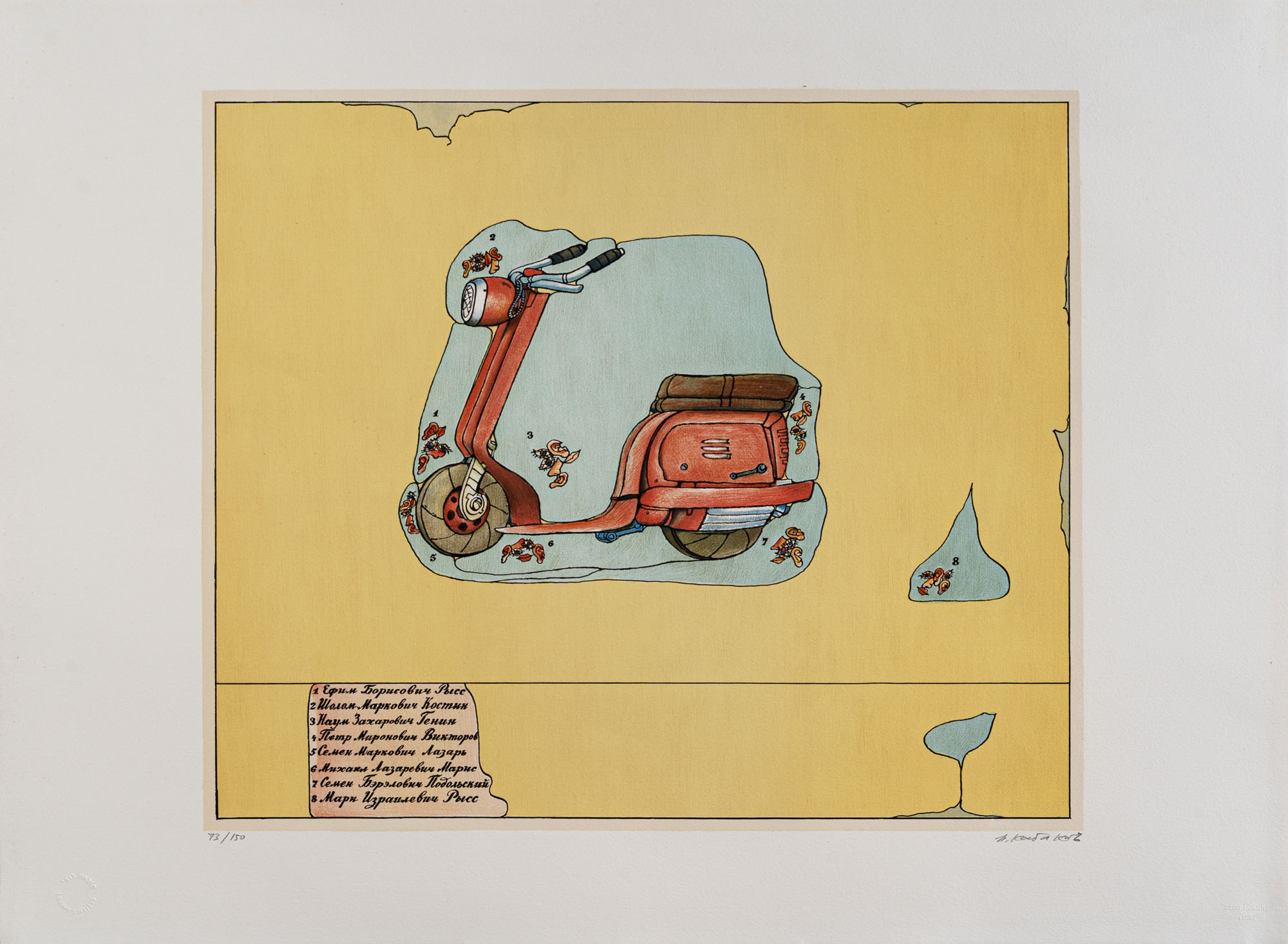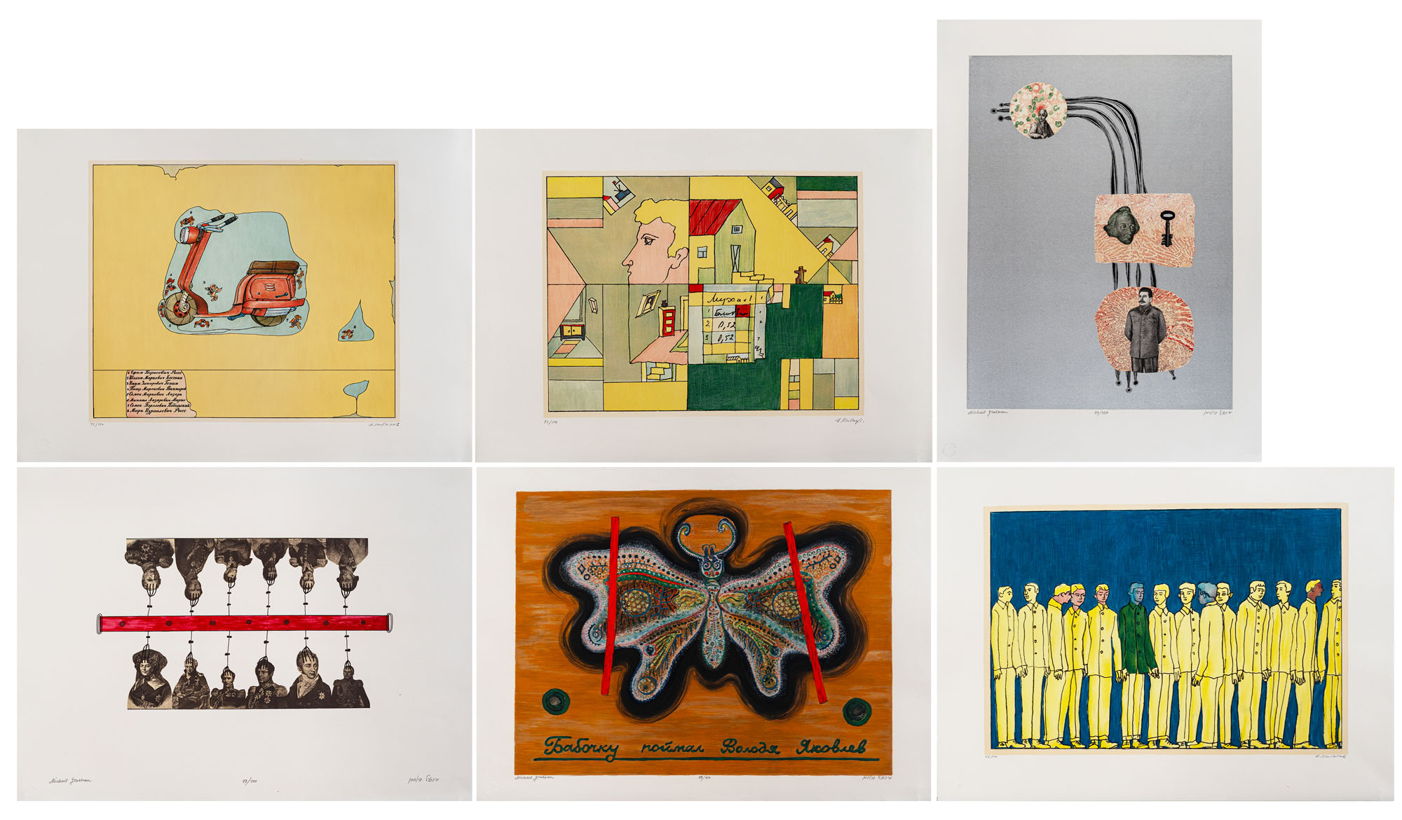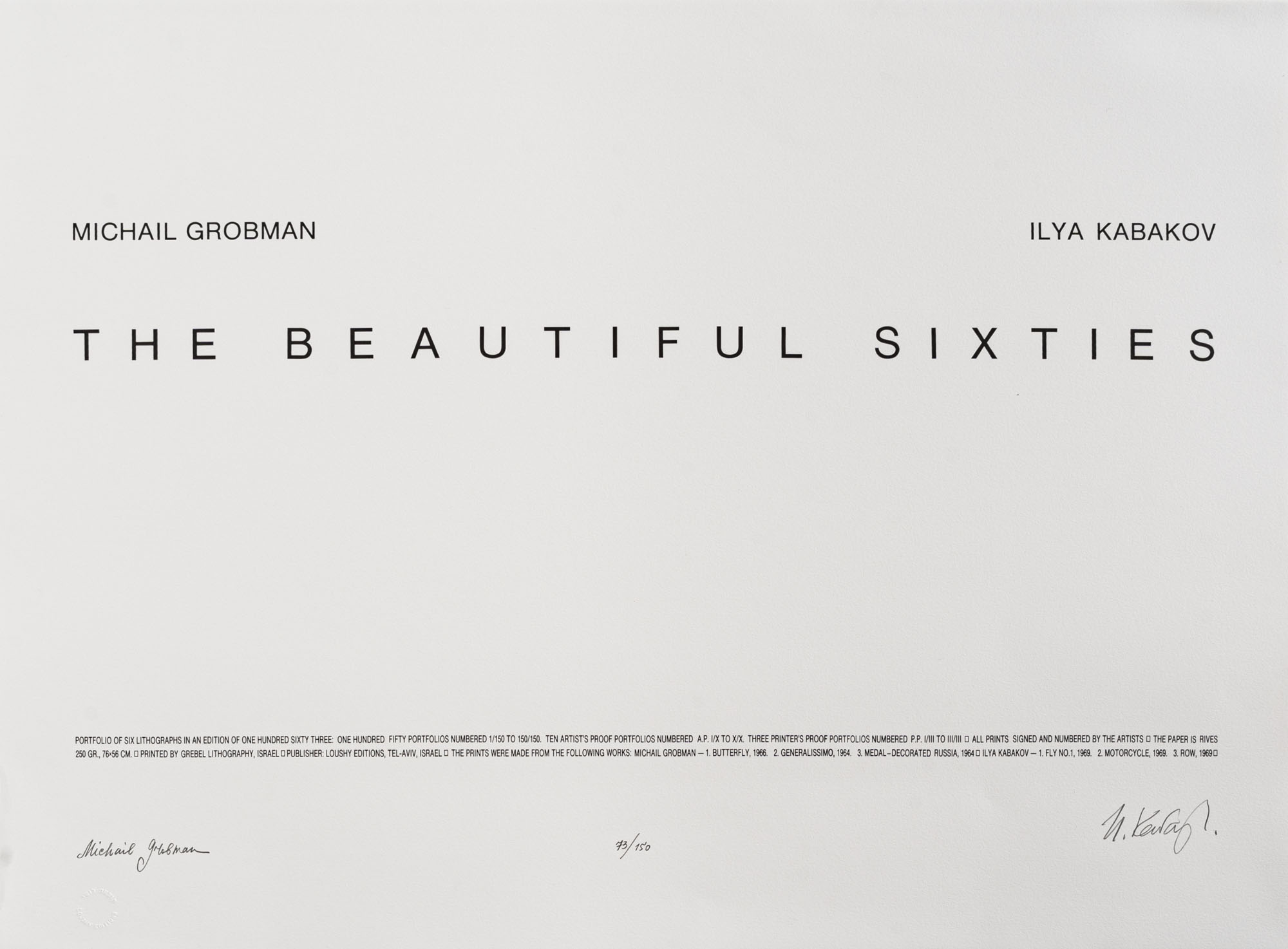 ILYA KABAKOV, MICHAIL GROBMANThe beautiful sixties1964-1969Portfolio comprendente sei litografie a colori, es. 73/150, Loushly Editions, Tel AvivDimensioni di ciascuna litografia: 55,5 x 75,5 cmTre litografie sono firmate a matita da Ilya Kabakov in basso a destra e numerata in basso a sinistra.Tre litografie sono firmate a matita da Ilya Kabakov e Michail Grobman e numerate in basso al centroPROVENIENZA:Collezione privata, Milano