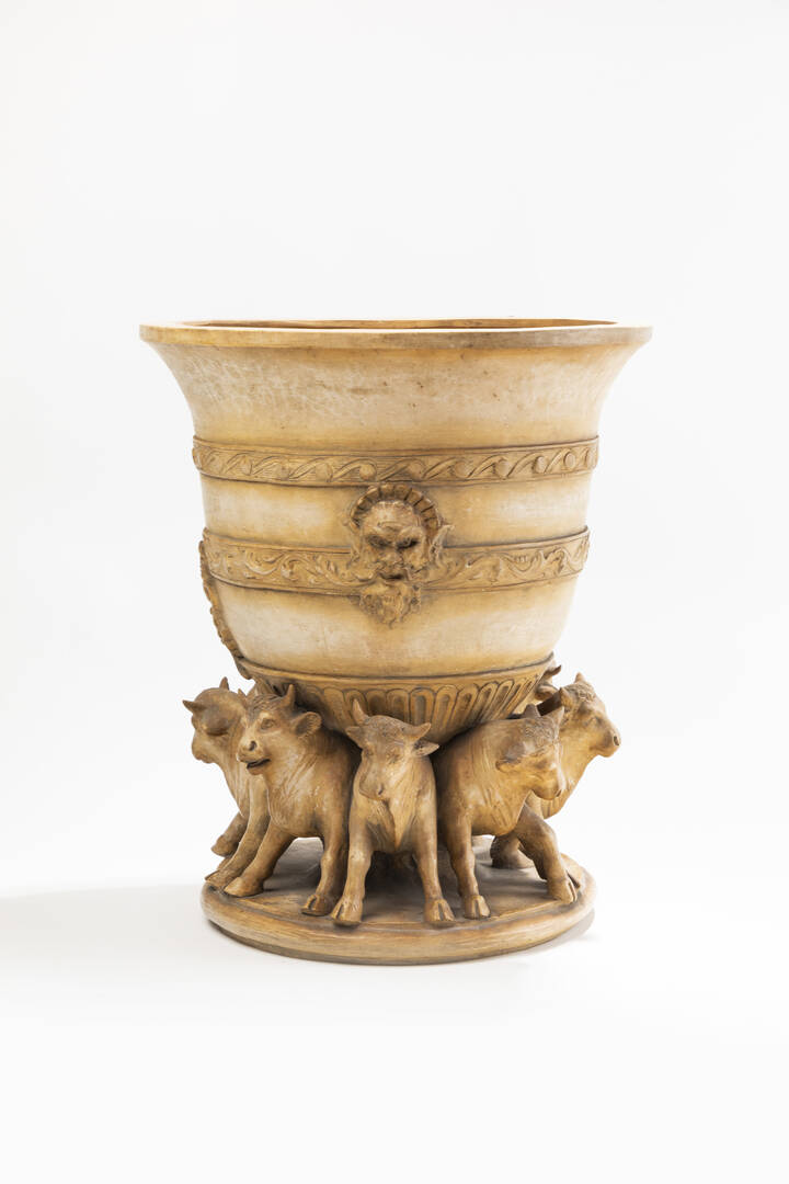 in terracotta dipinta; poggiante su base circolare decorata da tori reggenti la coppa centrale.