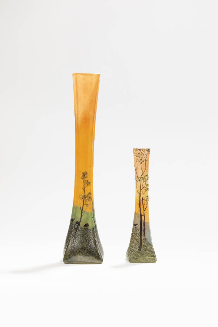 -Vaso soliflore a sezione quadrata in vetro doppio, con decoro di paesaggio pastorale finemente inciso ad acido e dipinto a smalti policromi su fondo arancio. Espoca 1880 ca. H cm 30