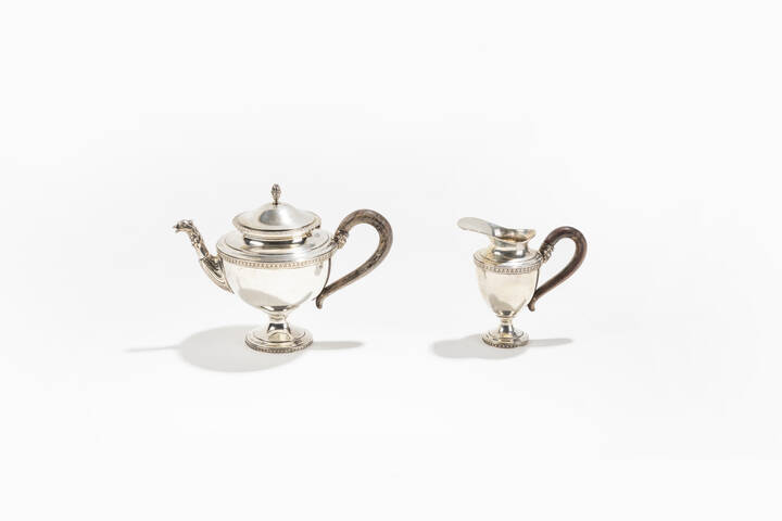composto da lattiera e teiera, Decorati da motivi a palmette, poggianti su basi circolari; manici in legno