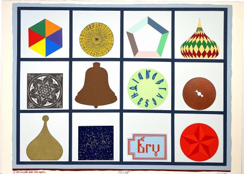 Serigrafia su carta da acquarello pregiata “Arches” con elementi frustellati incollati a mano, cm 56×76