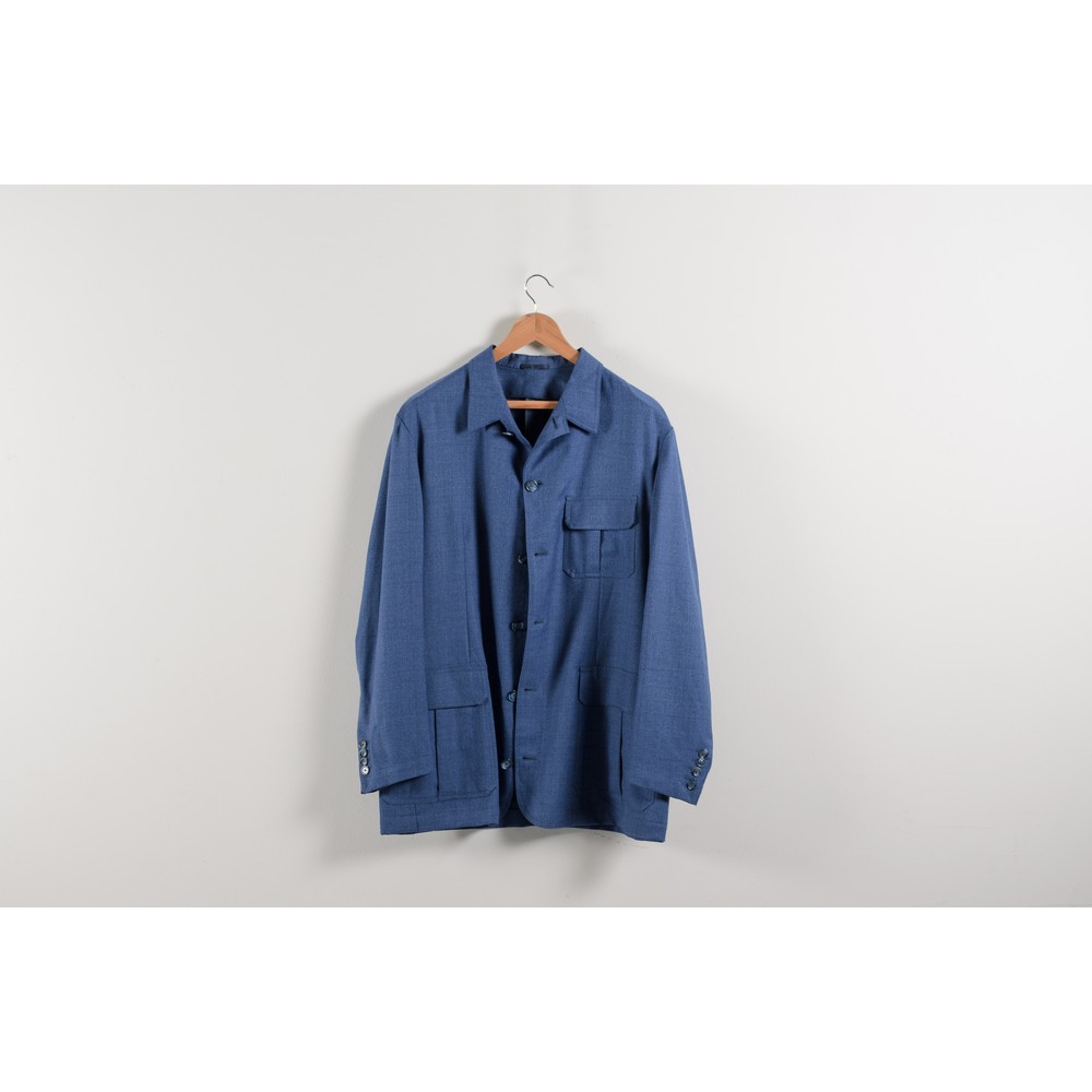 Giacca in lino blu, apertura frontale con sei bottoni, due tasche basse ed un taschino. Taglia XL.