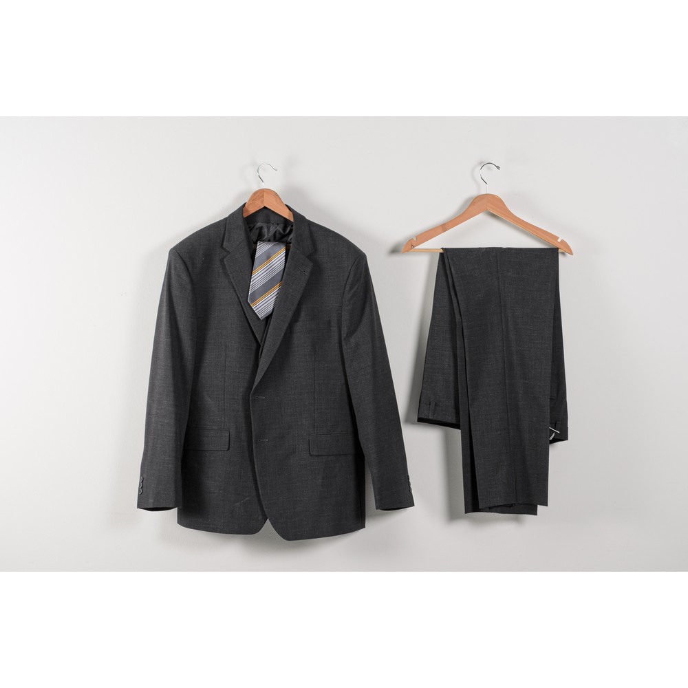 Completo da steward composto da giacca, pantalone e gilè in fresco di lana grigio, una gravata regimental grigia e gialla. Taglia XL Segni di uso.