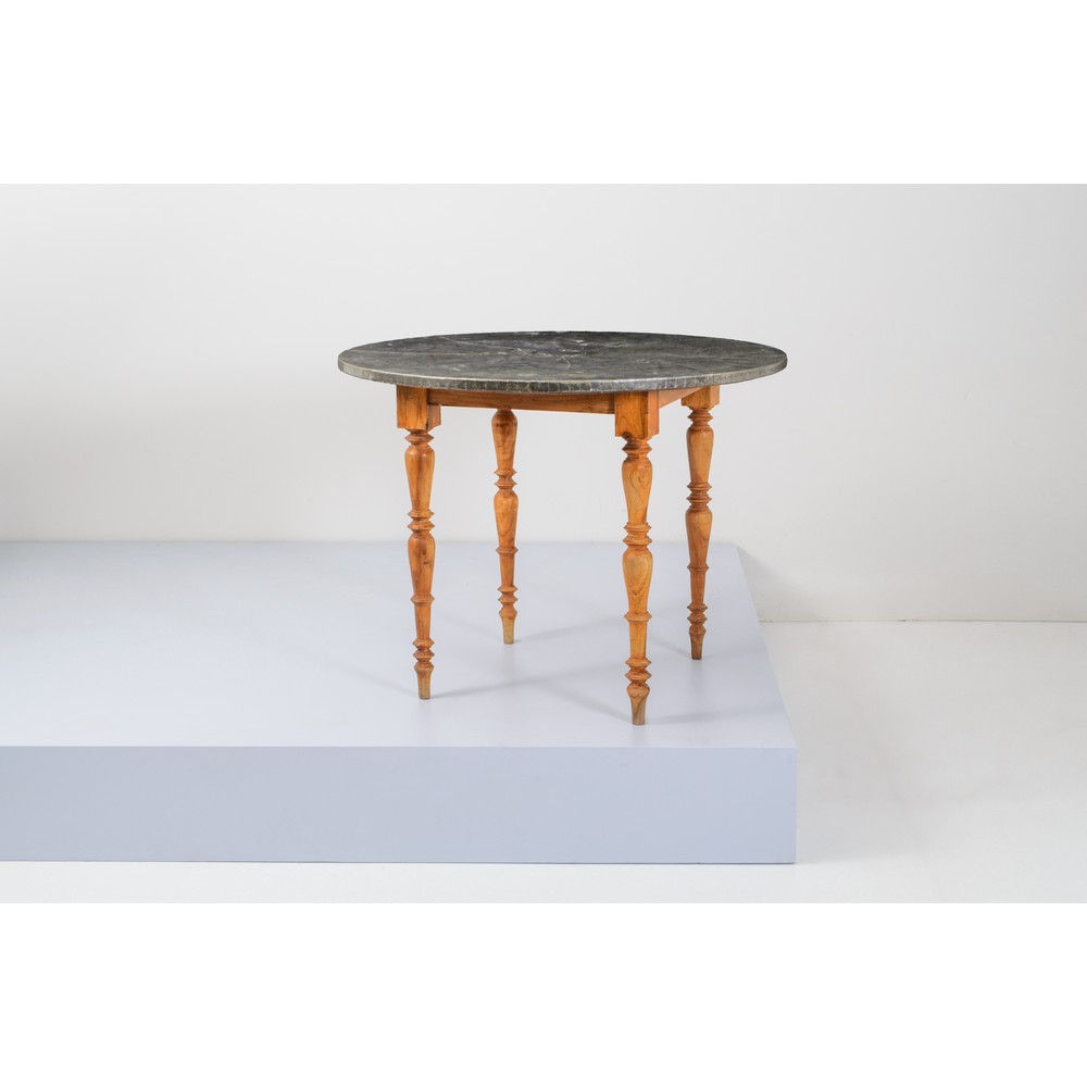 Tavolo con struttura in legno, piano circolare con rivestimento in metallo, gambe tornite. Marchio di produzione