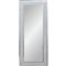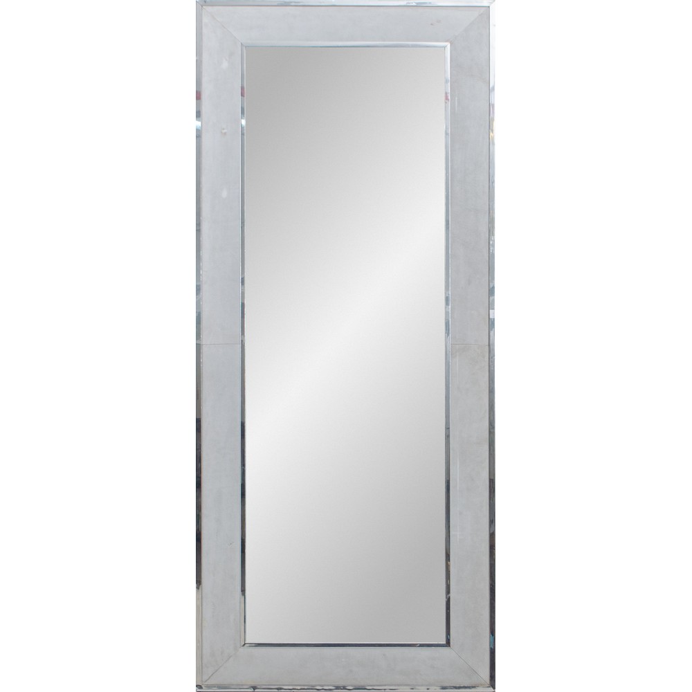 Grande specchio da parete rettangolare, struttura in metallo con cornice in pelle scamosciata grigia, cristallo specchiato centrale. Lievi difetti alla pelle.