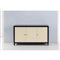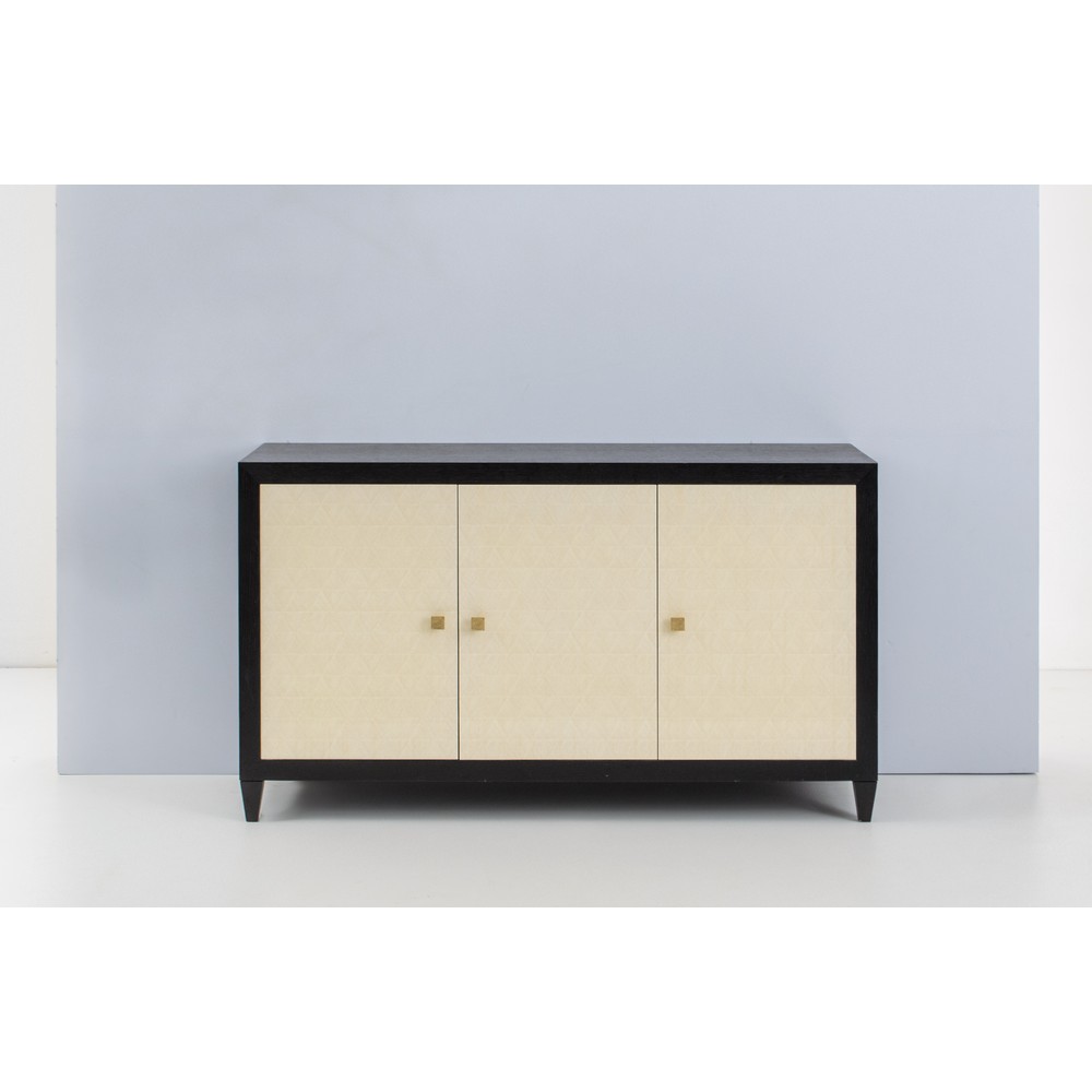 Sideboard in legno ebanizzato, sul fronte tre sportelli con chiusura a battente in legno con decoro geometrico su fondo avorio, ripiano interno.