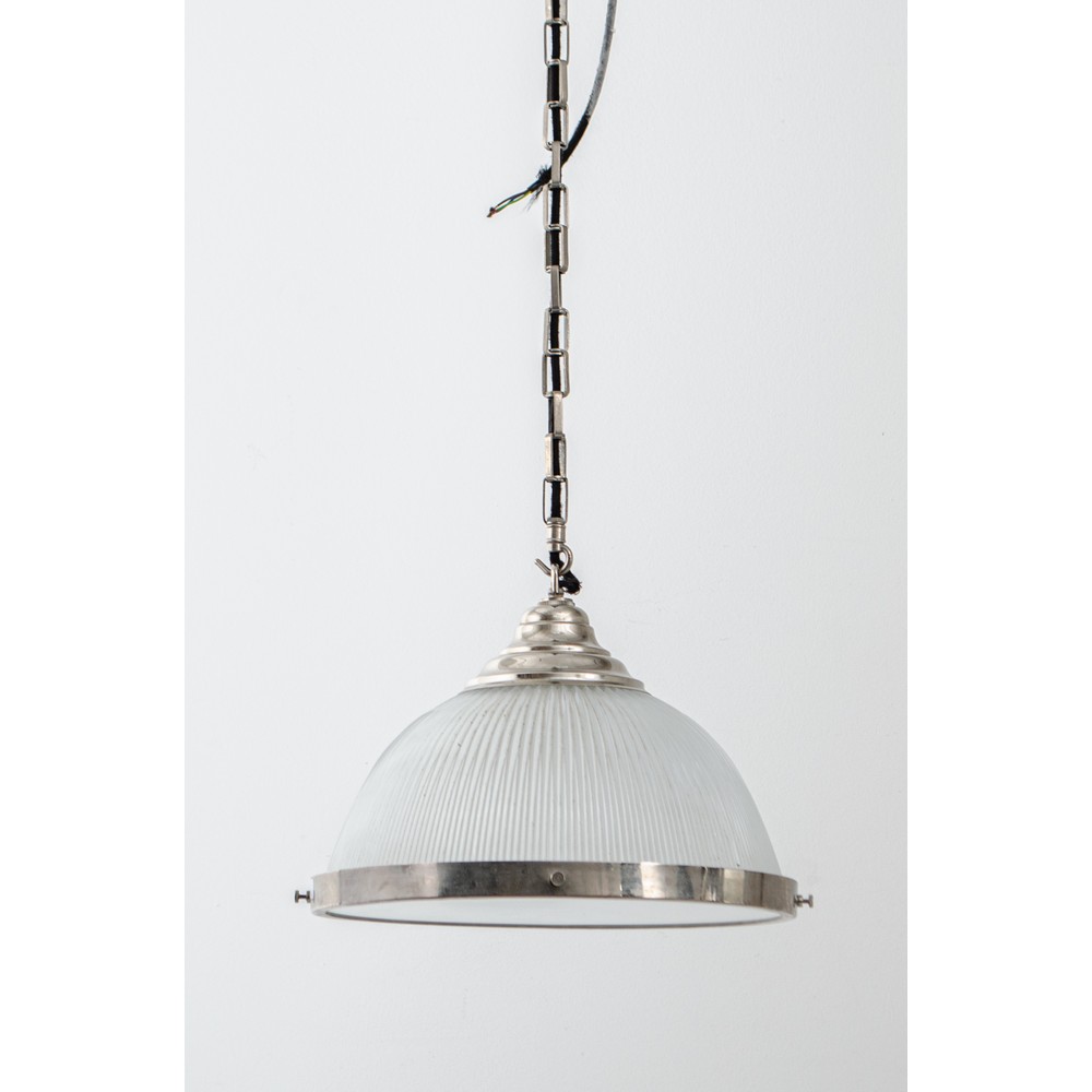 Lampada a sospensione ad una luce, struttura in metallo cromato con diffusore semisferico in vetro satinato e lavorato a stampo con scanalature, catena a maglie rettangolari, vetro circolare satinato.