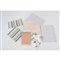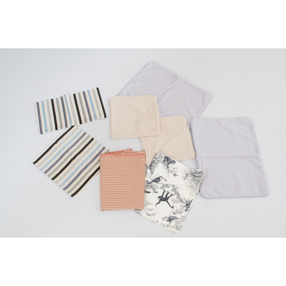Due scampoli di tessuto Hermes, uno in cotone bianco con decori tropicali grigio scuro, uno con decoro geometrico ruggine e bianco. Marchio di produzione. Due cuscini di dimensione differente in satin con decoro a righe celeste, blu, grigio e panna. Due cuscini quadrati in tessuto avorio e due cuscini rettangolari in tessuto grigio perla. Segni di uso.