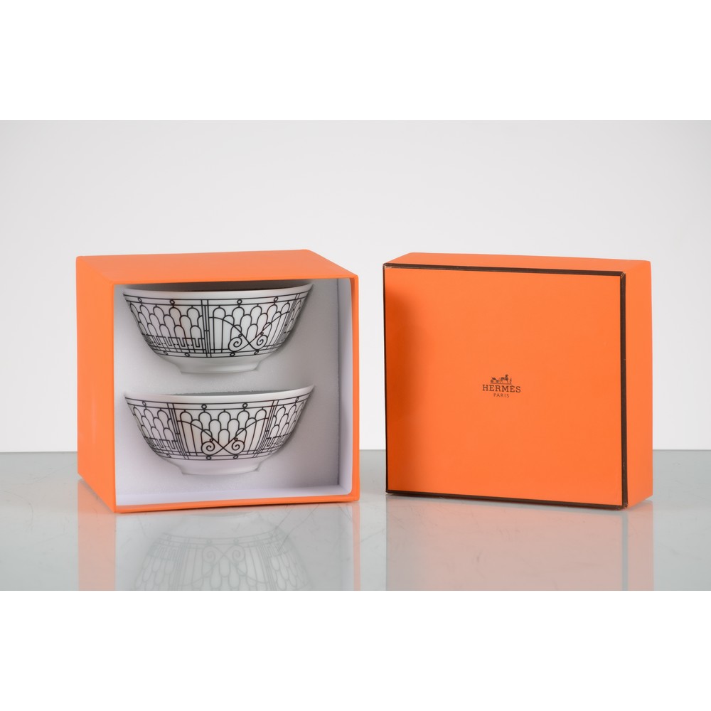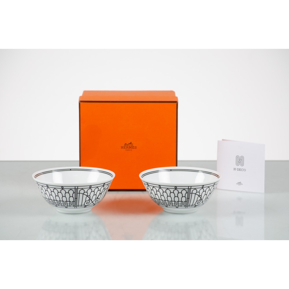 Due ciotole in porcellana bianca modello “H Decó” disegnate da Benoit Pierre Emery, decori di ferro battuto nero. Marchio di produzione e scatola originale.