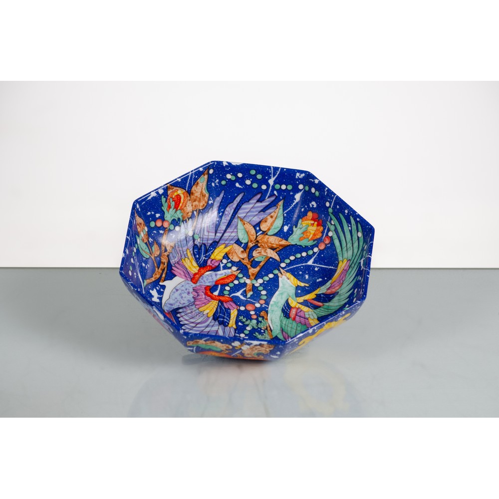Ciotola ottagonale in porcellana della collezione "Pierres d'Orient et d'Occident" di Hermès, decori policromi su fondo blu. Marchio di produzione.