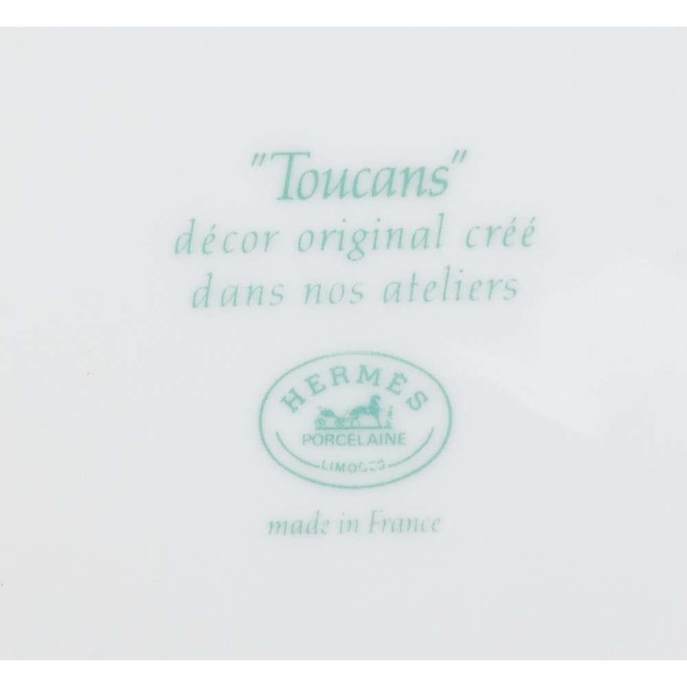 Due piatti di dimensione differente della serie “Toucans” disegno di Laurence Thioune, porcellana bianca con decori policromi di tucano. Marchio di produzione.