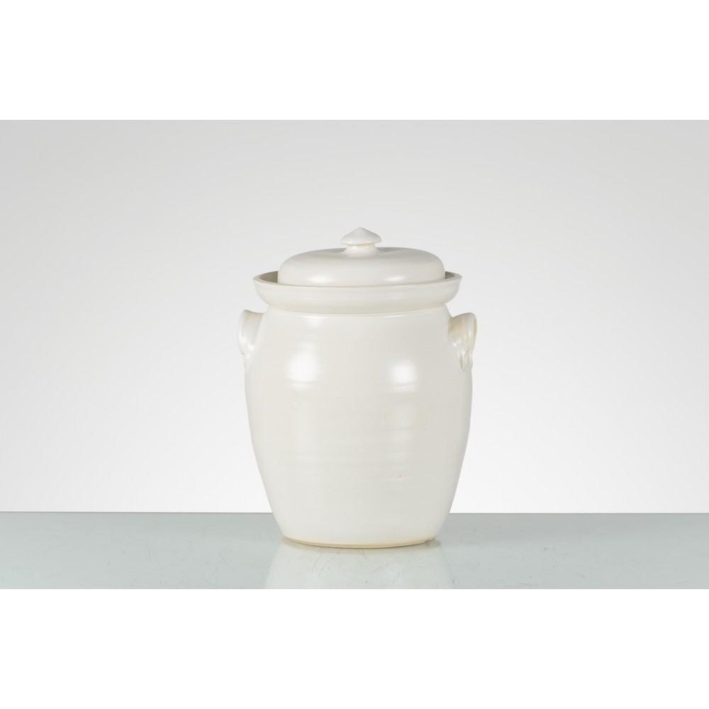 Piccola giara in grès bianco utilizzata per la fermentazione. Marchio di produzione.