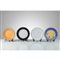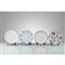 Otto piatti piani in porcellana bianca con differenti decori policromi, alcuni con bordo in oro e argento. Marchio di produzione.