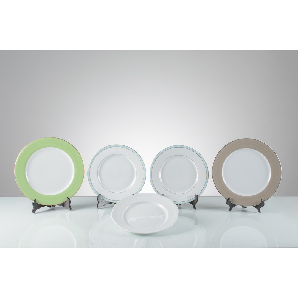 Nove piatti piani in porcellana bianca con differenti decori policromi, alcuni con bordo in oro e argento. Marchio di produzione.