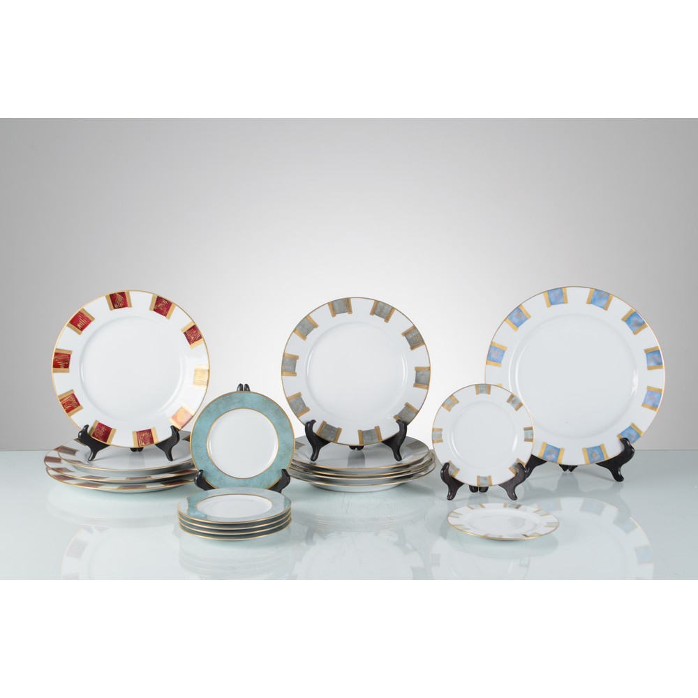 Diciassette piatti di dimensione differente della serie” Variation” e “Les Nacres”, porcellana bianca con decori geometrici verdi, bordeaux e oro. Marchio di produzione.
