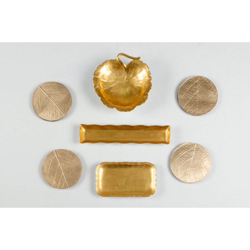 Tre porcellane rivestite in oro una a forma di foglia e due a vassoio. Quattro sottobicchieri circolari a stampo fogliaceo. Marchio di produzione.