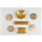 Tre porcellane rivestite in oro una a forma di foglia e due a vassoio. Quattro sottobicchieri circolari a stampo fogliaceo. Marchio di produzione.