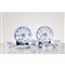 Servizio colazione in ceramica bianca con decori blu composto da sette pezzi: tre piatti, una tazza, una zuccheriera, una lattiera. Marchio di produzione.