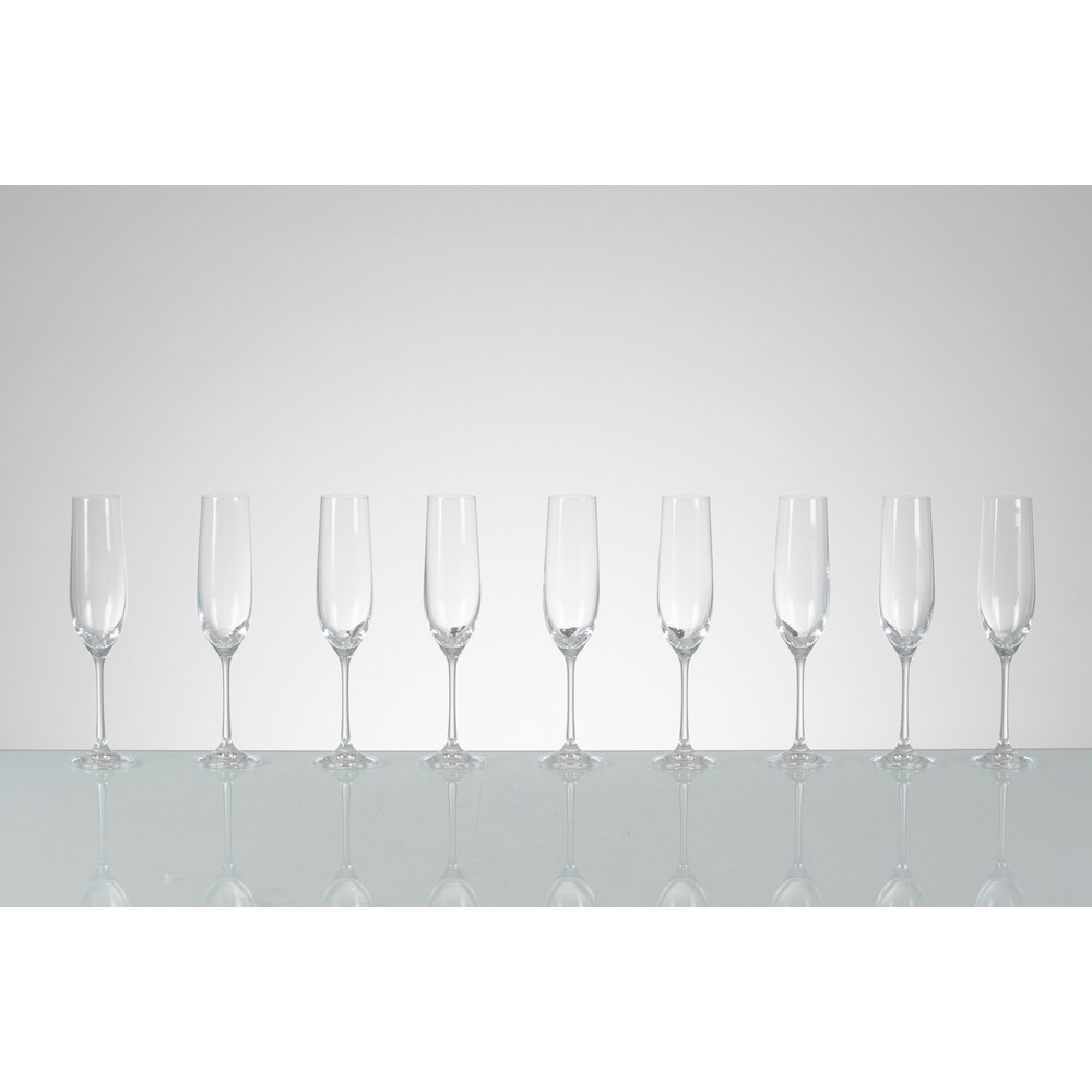 Nove Flutes da champagne in cristallo trasparente. Sbeccature. Marchio di produzione.