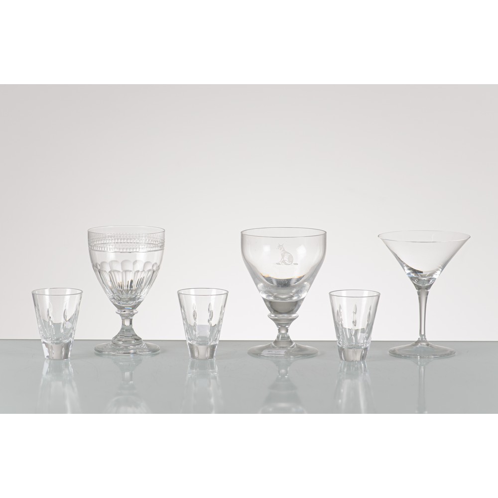 Sei bicchieri di diversa forma: tre bicchieri da liquore in cristallo trasparente con decori incisi; tre bicchieri differenti in cristallo due da acqua ed una coppa per Martini.