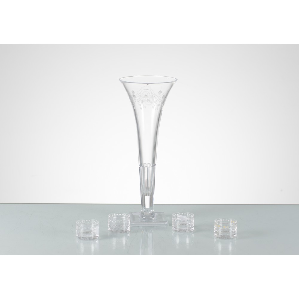 Quattro saliere in cristallo trasparente con decori incisi. Una vaso a tromba in cristallo trasparente e decorato incisi sulla parte superiore.