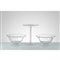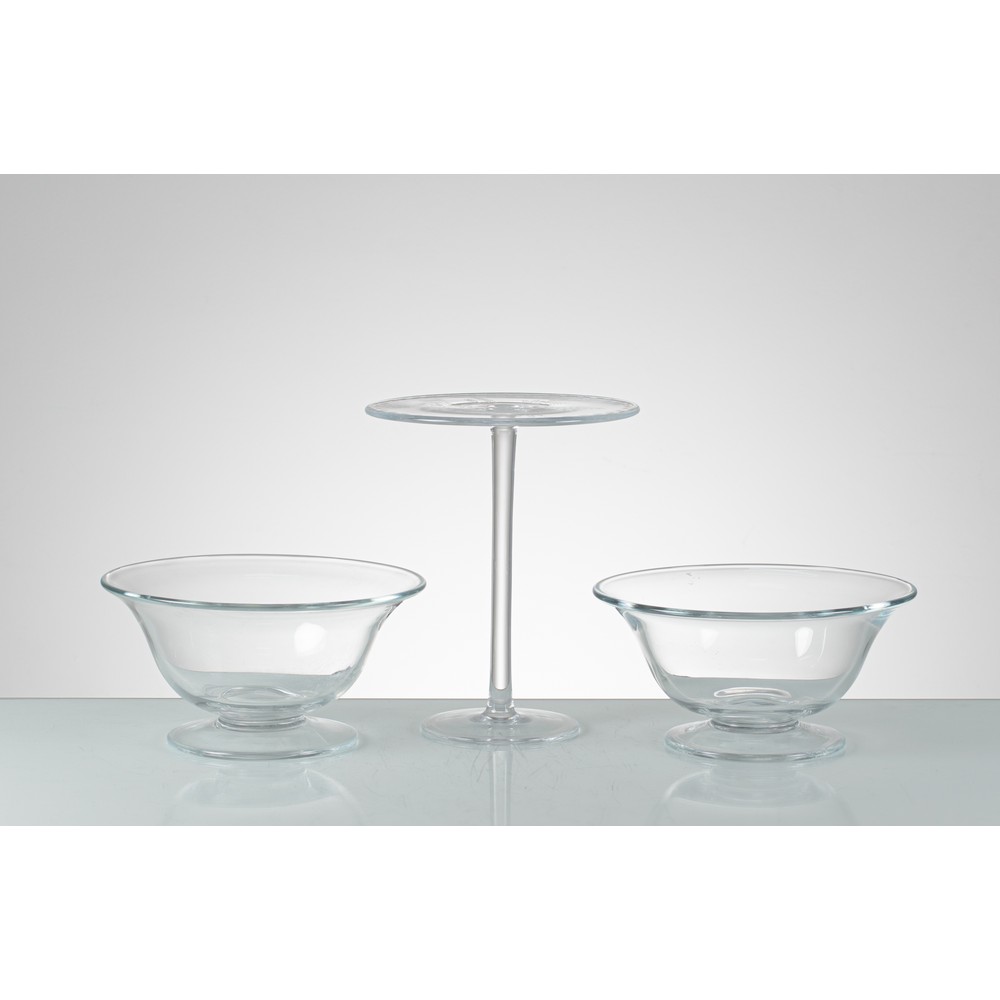 Alzata in vetro trasparente con piatto circolare con decori incisi. una coppia di coppe in vetro trasparente, corpo a campana a rovescia, base circolare.