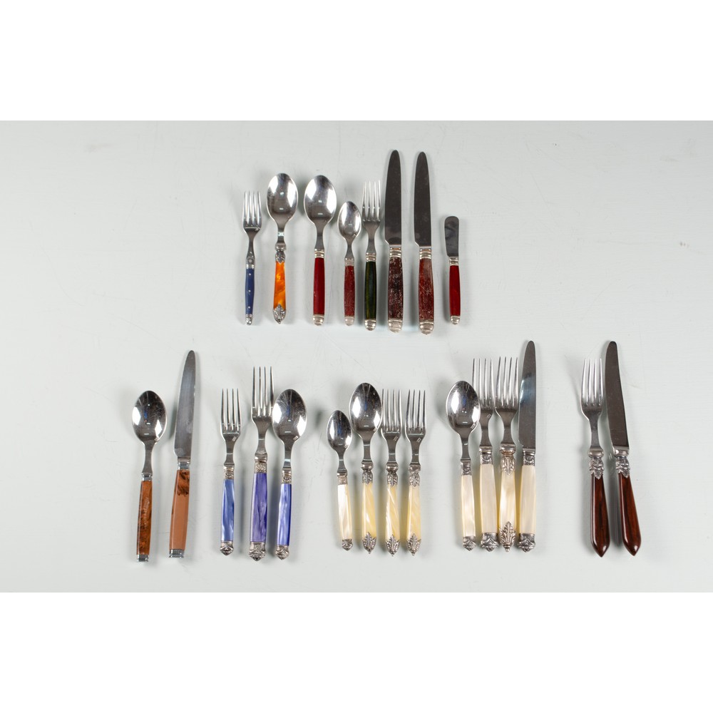 23 posate di diversa tipologia in acciaio con manici in legno e in diversi materiali ad effetto madreperla.