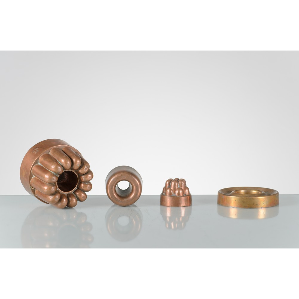 Quattro stampi per dolci di forma differente in rame. Segni di uso.