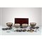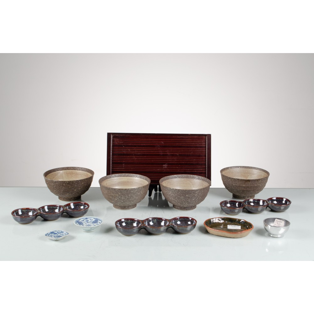 Dodici pezzi così suddivisi: un vassoio rettangolare in bamboo, quattro ciotole in grès marrone, tre set di ciotole triple in porcellana smaltata a fuoco frigio e marrone, due piccoli piattini per salsa in ceramica bianca a decoro blu, una ciotola in metallo argentato, una ciotola bassa in grès smaltato marrone. Marchi di produzione.