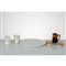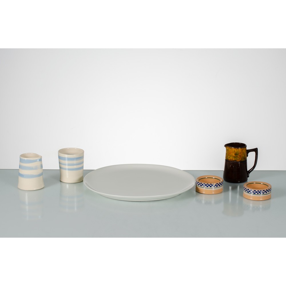 Due saliere in ceramica smaltata caramello e decorate con fascia a quadri bianchi e blu, un piatto circolare in porcellana bianca, un bicchiere ed una caraffa in porcellana smaltata avorio e decorata con fasce celesti, una caraffa in ceramica smaltata marrone con decori policromi sul collo. Marchi di produzione.