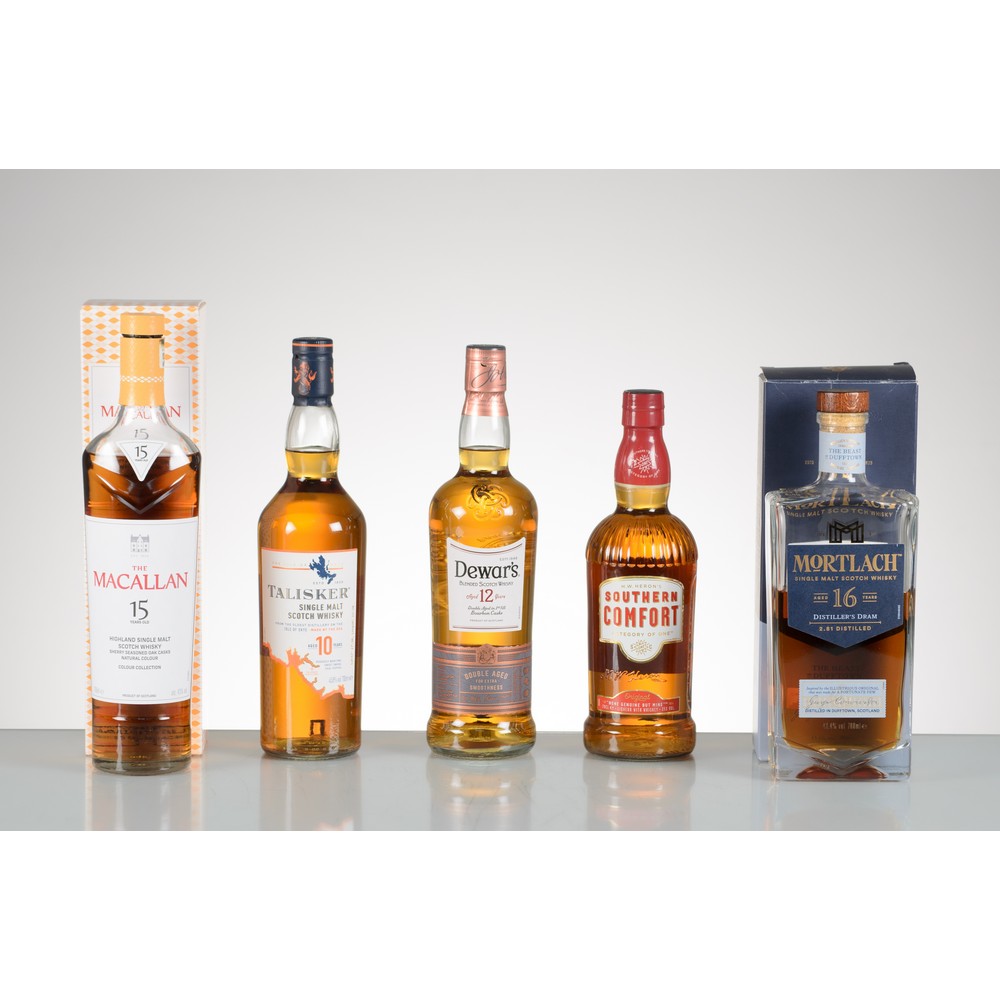 MACALLAN, TALISKER, DEWAR’S, HERON’S, MORTLACH., 5 bottiglie whisky