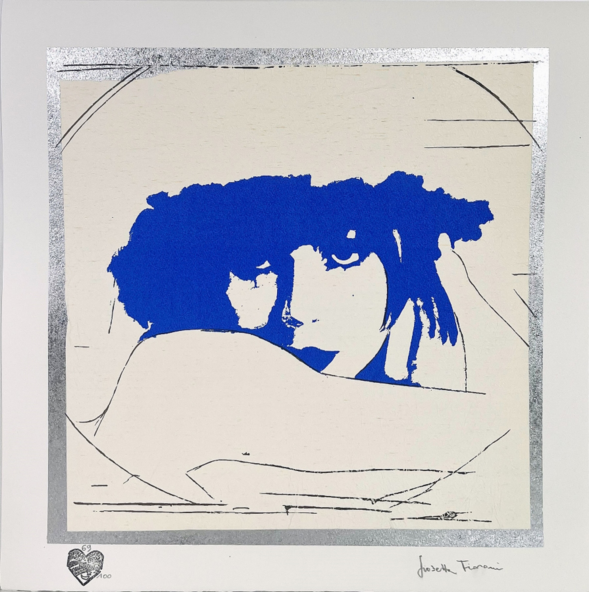 FIORONI GIOSETTA Roma 1932 "Doppio liberty blue" Serigrafia materica con pigmento blu klein e argento sintentico, applicazioni di carta velina e foglia argento, realizzata a mano su carta Pescia in cotone da 350 gr. cm 50x50. Firmata sul fronte in basso a destra, tiratura e timbro a secco dell'Archivio Parise Fioroni.