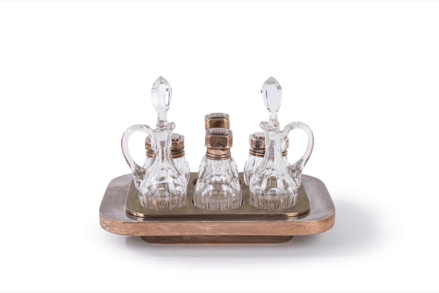 composto da oliera, acetiera, saliera, pepiera e due porta spezie, con coperchi di forma geometrica liscia.