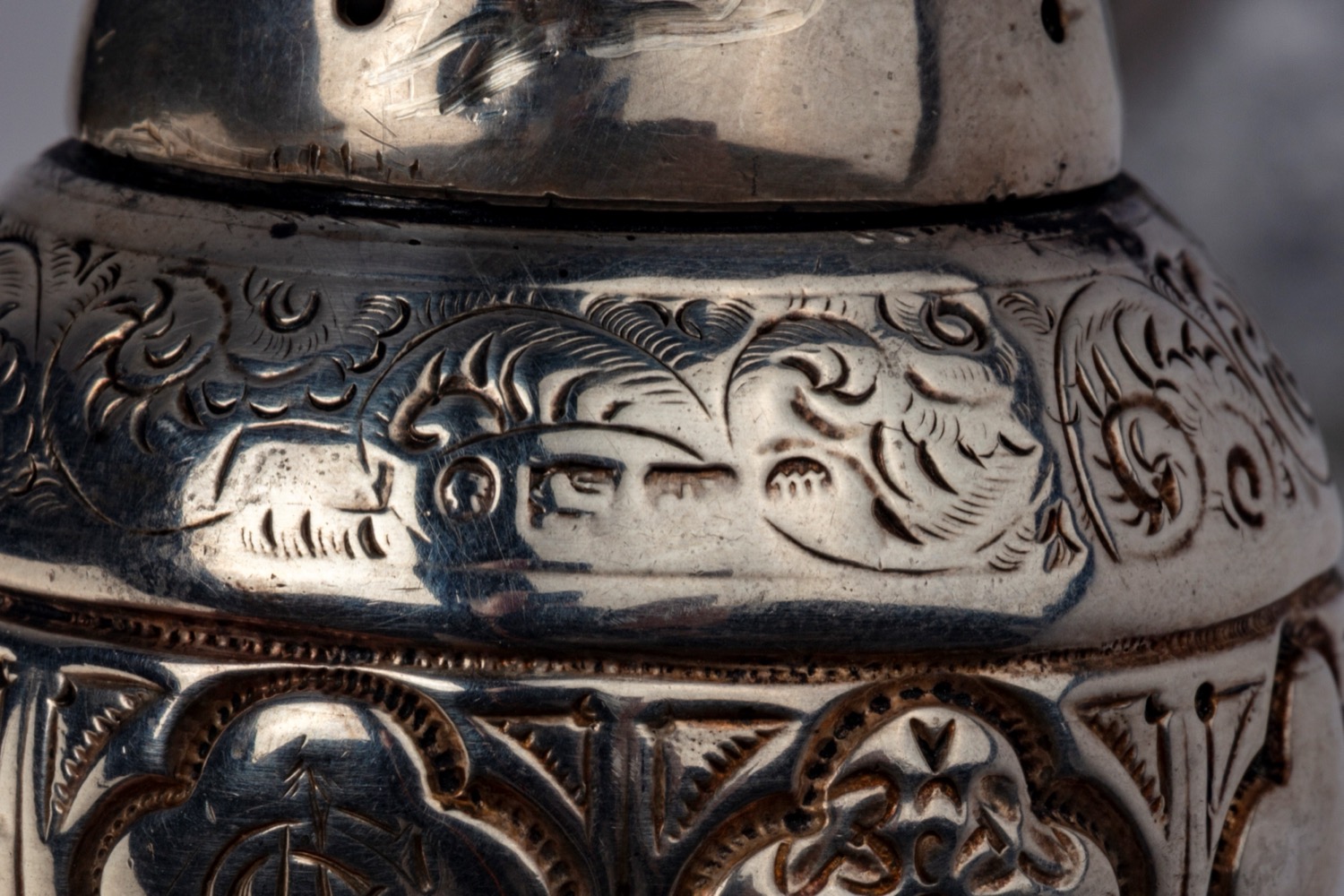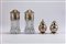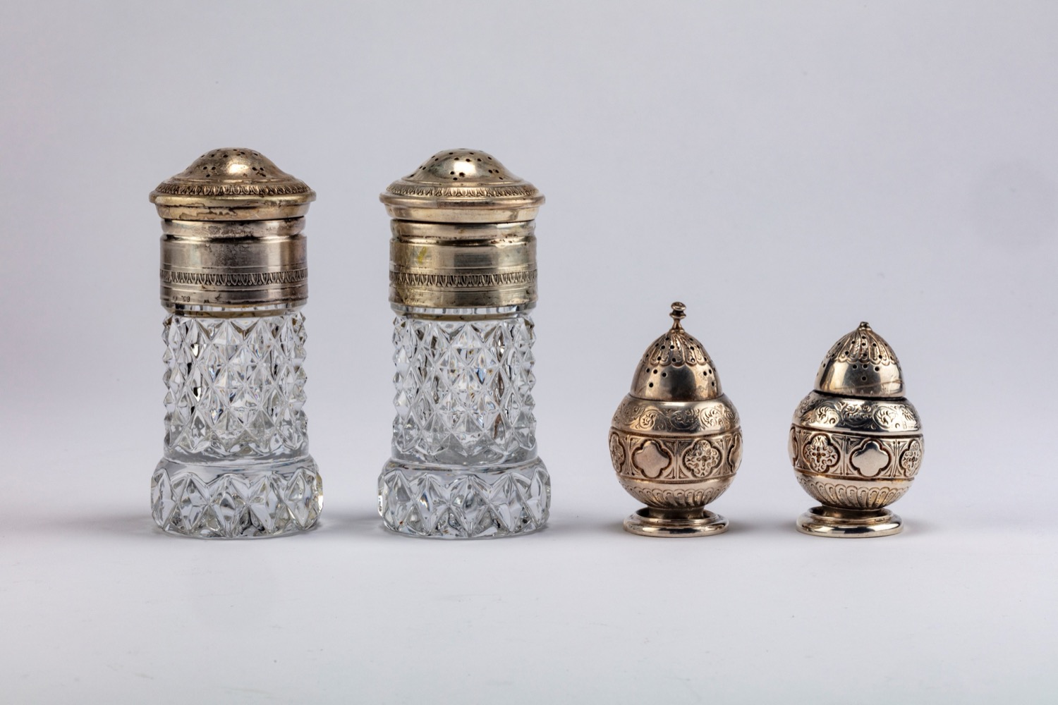 di diversa fattura e decoro, una coppia di forma piriforme con corpo inciso, una coppia in cristallo molato con spargisale in argento traforato.